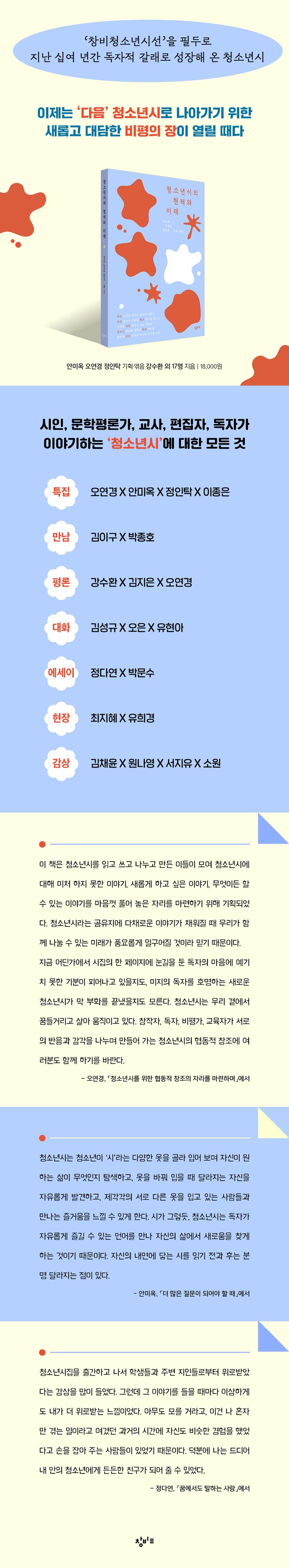 창비교육은 청소년에게도 그들의 삶과 감각에 부합하는 시가 창작되어야 한다는 필요성을 받아안아 2015년, 전문 시인이 창작하고 청소년이 감상하는 본격적인 청소년시 시리즈 ‘창비청소년시선’을 출범하였다. 지난 십 년간 오십 권의 시집을 출간하면서 청소년시는 하나의 독자적인 갈래로 자리 잡았으며, 청소년시가 지속적으로 창작되고 향유될 수 있는 기반이 마련되었다. 『청소년시의 현재와 미래』는 이렇듯 지난 십여 년간 축적된 청소년시의 성과와 한계를 돌아보고, 미래를 그려 보기 위해 기획·출간되었다.