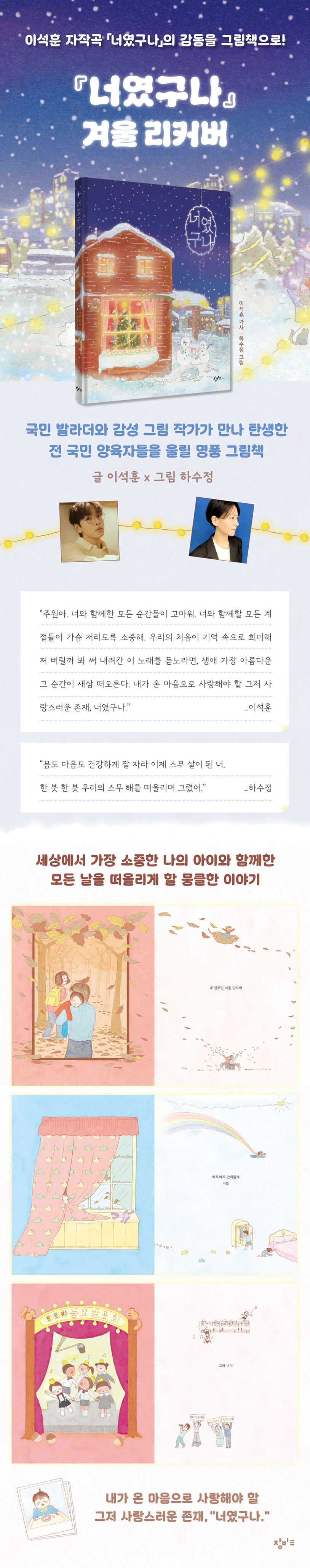 가수, 뮤지컬 배우, MC, 라디오 DJ 등 다방면에서 활약하는 만능 아티스트 이석훈이 아들의 백일 선물로 발표한 자작곡 「너였구나」에 그림책 작가 하수정의 따뜻하고 포근한 그림이 더해져 완성된 그림책. 여러 매체를 통해 주목받고 대중의 사랑을 받은 노래 「너였구나」가 가족의 사랑과 성장, 따뜻함을 보여 주는 작품이자 세상 모든 양육자가 내 아이에게 해 주고 싶은 말을 담은 다정한 메시지 그림책으로 재탄생되었다.
