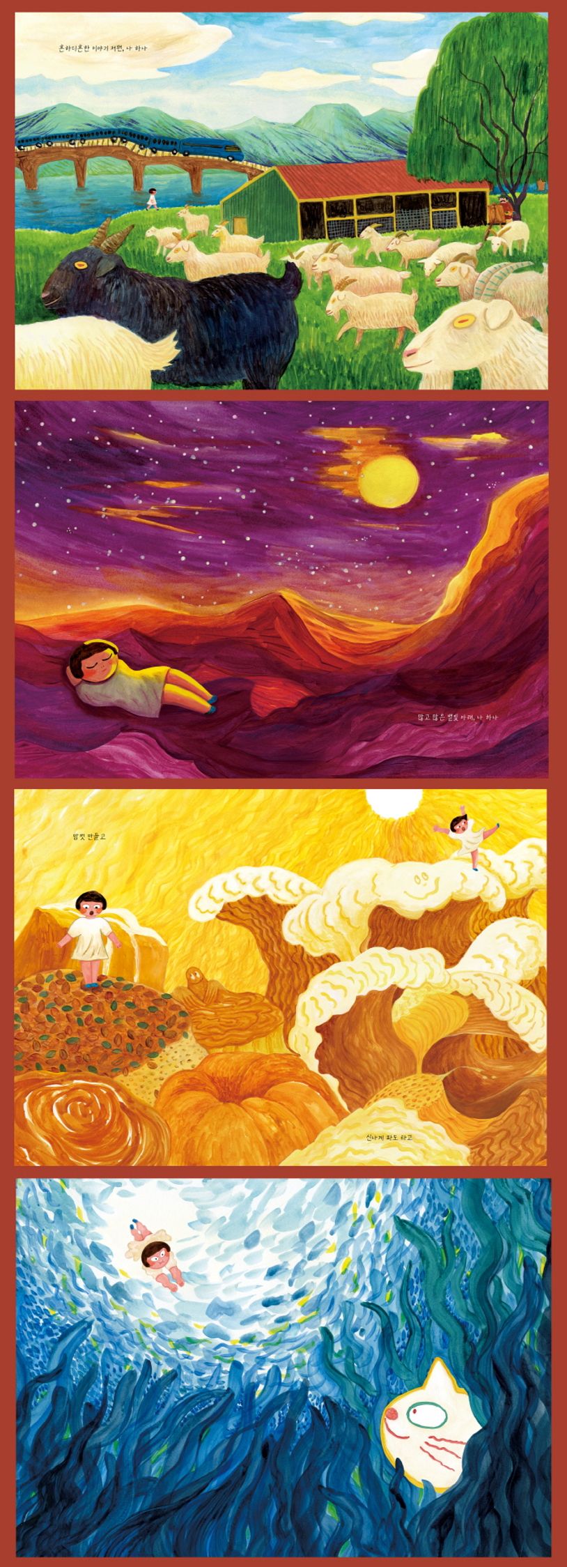 바람그림책 121권. 모두가 웃고 있어요. 나만 안 웃어요. 싱거운 이야기를 나누어요. 나만 귀 기울이지 않아요. 모두 밤하늘의 별빛처럼 서로 반짝이지만, 나는 혼자예요. 가만히 눈을 감았는데, 어떤 소리가 들렸어요. 많고 많은 것 중 하나라서 좋대요. 서로 어우러져 맘껏 만들고, 파도 타고, 콧노래를 부른대요. 나는 마음이 이끄는 대로 계속 상상해요. 커다란 물고양이를 만나요. 함께 여행하고 모험해요. 기분이 좋아요. 즐거워요. 계속 행복하고 싶어요. 나도 모두와 함께 어울릴 거예요. 모두와 함께하는 이 세상이 참 좋아요!