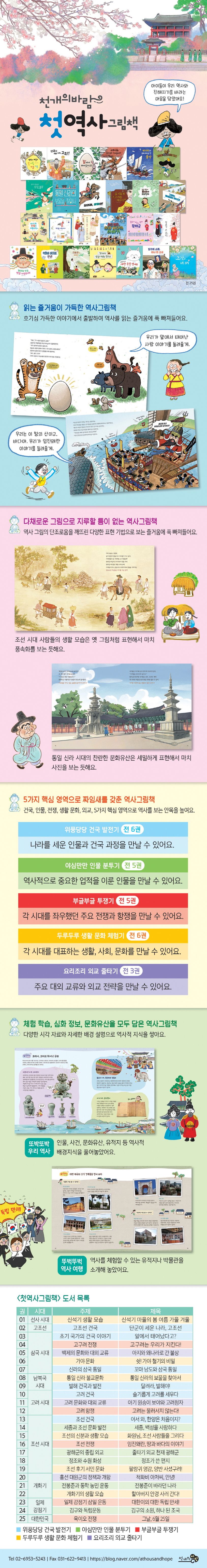 다채롭고 생동감 넘치는 그림은 역사를 시각적으로 이해할 수 있을 뿐만 아니라, 어린 친구들의 호기심과 상상력을 불러일으켜요. 각 시대를 대표하는 인물, 사건, 문화유산, 유적 등을 충실하게 담아냈으며, 풍부한 자료를 통해 역사적 배경지식을 넓힐 수 있지요. 선사 시대부터 시작하여 전근대와 근현대를 모두 아우르는 한국사 통사를 〈첫역사그림책〉 전 25권에 담았어요. 〈첫역사그림책〉은 처음 역사를 만나는 어린 친구들이 역사와 친해질 수 있는 마중물이 되어 줄 책이에요.