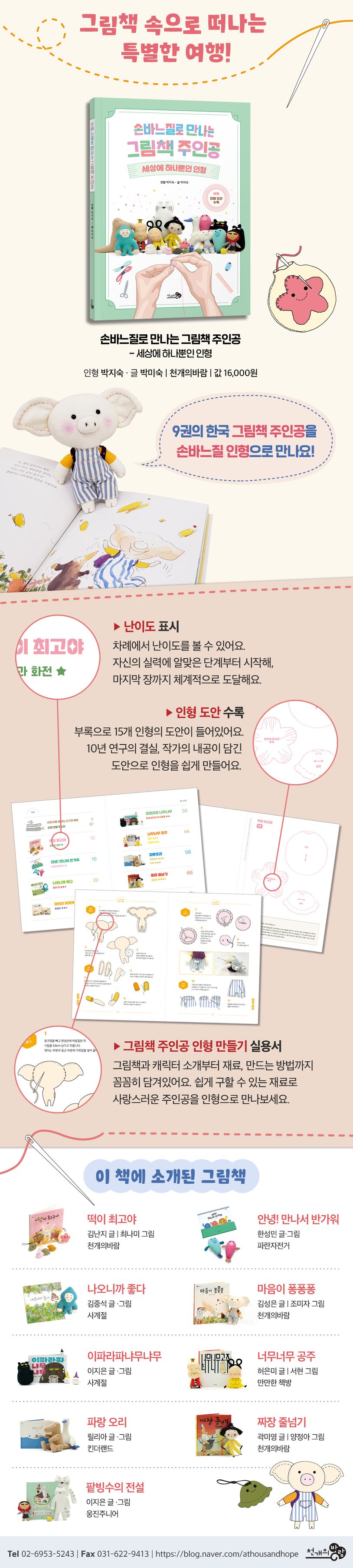 독자들에게 오랫동안 사랑받은 한국 그림책 중 〈떡이 최고야〉, 〈안녕! 만나서 반가워〉, 〈나오니까 좋다〉, 〈마음이 퐁퐁퐁〉, 〈이파라파냐무냐무〉, 〈너무너무 공주〉, 〈파랑 오리〉, 〈짜장 줄넘기〉, 〈팥빙수의 전설〉 총 9권의 주인공을 손바느질 인형으로 만나보는 책입니다. 캐릭터에 대한 소개부터 만드는 방법, 도안까지 꼼꼼히 수록했습니다.