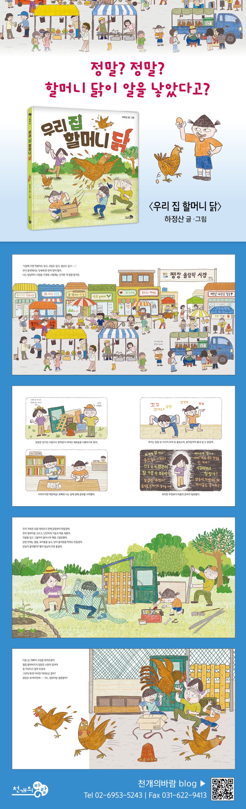 바람그림책 161. 〈우리 집 할머니 닭〉은 가족과 함께 키운 노계가 보여 주는 감동적인 변화를 그린 그림책입니다. 알을 낳지 못하는 노계라는 이유로 트럭에 갇혀 팔리기만을 기다리던 '할머니 닭'. 주인공 가족은 '할머니 닭'들 네 마리를 사 알뜰히 보살핍니다. 그러던 어느 날, '할머니 닭'은 느릴지라도 알을 낳게 되고, 병아리를 키워내며 ‘엄마 닭’이 됩니다. 생명에 대한 존중과 사랑을 배우며 성장하는 주인공과 함께 작은 생명이 가져온 따뜻한 변화, 가족 간의 깊어진 유대감을 느낄 수 있는 그림책입니다.