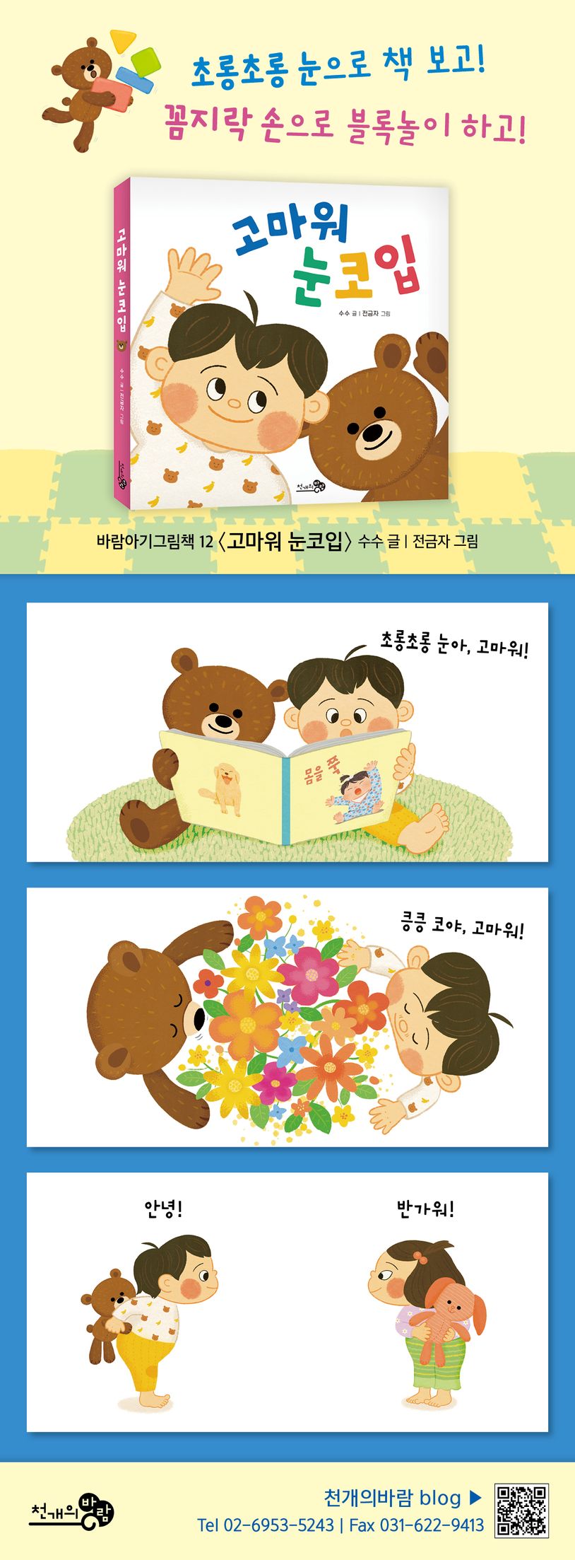 〈고마워 눈코입〉은 우리 몸 각각의 부위들 이름과 어떤 역할을 하는지를 보여 줍니다. 몸을 가누기 시작하는 아이에게 자연스레 나의 몸을 이해하고, 즐겁게 신체 활동을 할 수 있도록 이끄는 보드북입니다.