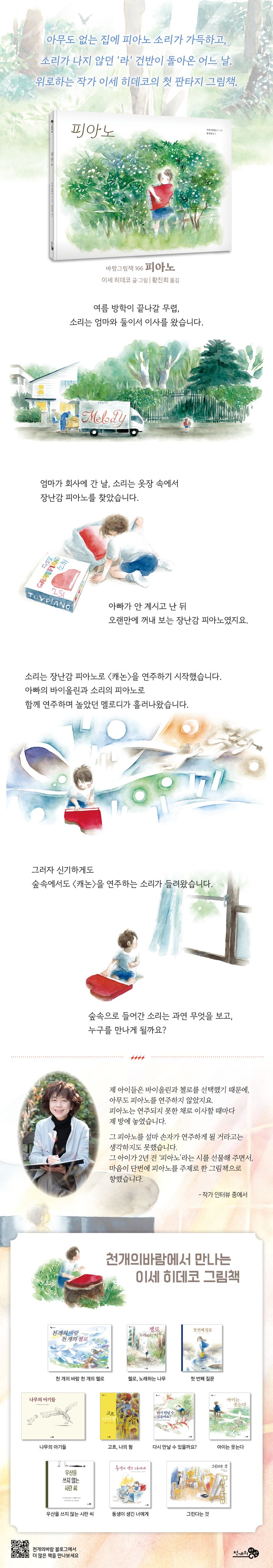 바람그림책 166. 여름 방학이 끝나갈 무렵, 소리는 엄마와 둘이서 작은 집에 이사를 왔습니다. 집 옆에는 숲처럼 보이는 곳이 있었지요. 엄마가 출근한 날, 소리는 옷장 속에서 장난감 피아노를 찾았습니다. 아빠가 안 계시고 난 뒤 ‘라’ 소리가 나지 않아 오랫동안 치지 않았지요. 소리가 오랜만에 아빠와 함께 연주하며 놀았던 〈캐논〉을 쳐 볼 때였습니다. 집 바깥의 숲속에서 똑같이 〈캐논〉을 연주하는 소리가 들려왔지요. 궁금증을 참지 못하고 장난감 피아노를 들고 숲속으로 간 소리. 소리는 숲속에서 무엇을 보고 듣게 될까요? 40년이 넘는 세월 동안 그림책 작가로 살아온 이세 히데코의 첫 음악 판타지 그림책입니다.