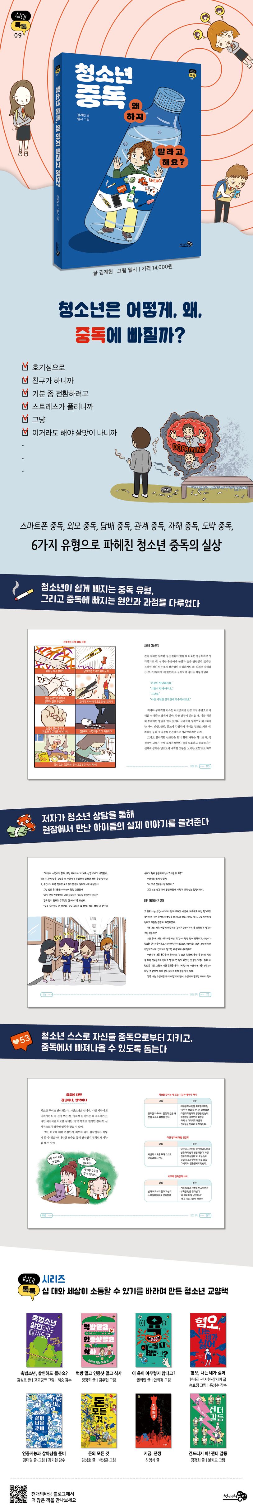 중독, 아직도 어른들만의 문제일까? 매년 3천 명 안팎의 십 대 청소년이 알코올, 약물, 도박, 인터넷 중독으로 진료받는다. 그러나 어쩌면 속수무책으로 방치된 채, 중독 문제로 고통받는 청소년은 이보다 더 많을지 모른다. 중독은 신체적 중독과 정신적 의존증을 동시에 일컫는 말로, 청소년 중독은 특히 의존증으로 표현되는 행위 중독에서 더욱 두드러지게 나타난다. 과도한 피어싱, 고카페인 음료 섭취, 폭식과 다이어트 반복, 관계 집착, 성형이나 화장 집착, 도박이나 도둑질, 그리고 습관적 자해나 자살 시도 등 청소년은 다양한 행위 중독에 빠져 있다. 2019년, 세계보건기구(WHO)는 섭취 중독만 질병으로 인정하던 태도를 바꿔 행위 중독(의존적 중독)도 질병으로 인정했다. 행위 중독은 개인의 질병일 뿐만 아니라, 심각한 사회 문제이기도 하다.
