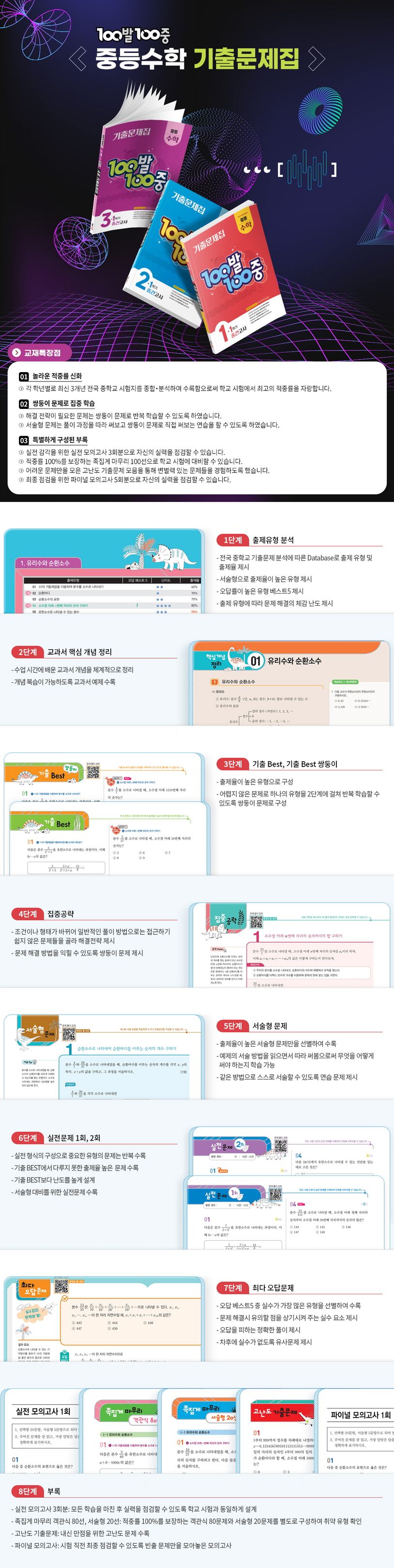 최근 3년간 전국 중학교 기출문제를 분석하여 출제 경향과 출제율을 기반으로 한 실전 중심의 교재이다. 출제율이 높은 기출 Best 문제와 과제용 기출 Best 쌍둥이 문제, 학생들이 쉽게 따라서 쓸 수 있도록 서술형을 쌍둥이 문제로 제공하고, 조건이나 형태가 바뀌어서 출제되어 해결방법이 쉽지 않은 유형의 문제를 별도로 선별하여 구성한 집중공략 코너에서는 손쉬운 해결전략을 제시한다. 100발100중 중등수학 기출문제집의 큰 장점으로 알려진 특별부록에서는 실전 감각을 점검할 수 있는 실전 모의고사 3회분, 시험에 반드시 나오는 문제로 구성된 족집게 마무리 100선(객관식 80선, 서술형 20선), 수학 만점자를 가리기 위해 출제되는 고난도 기출문제, 마지막으로 시험 직전 최종 점검을 할 수 있는 파이널 모의고사 5회분을 제공한다. 또한, 100발100중 홈페이지 www.100bal.com에서 문제풀이 동영상 강좌를 무료로 제공하고 있다.