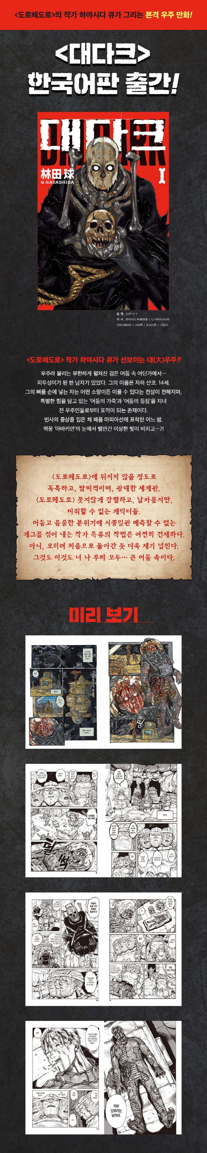 넷플릭스 화제의 애니메이션 〈도로헤도로〉의 작가 하야시다 큐가 그리는 본격 우주 만화! 〈도로헤도로〉에 뒤지지 않을 정도로 독특하고, 탐미적이며, 광대한 세계관. 〈도로헤도로〉 못지않게 강렬하고, 날카롭지만, 미워할 수 없는 캐릭터들. 어둡고 음울한 분위기에 시종일관 예측할 수 없는 개그를 섞어 내는 작가 특유의 작법은 여전히 건재하다. 아니, 오히려 처음으로 돌아간 듯 더욱 재기 넘친다. 그것도 이것도 너 나 우리 모두… 큰 어둠 속이다.