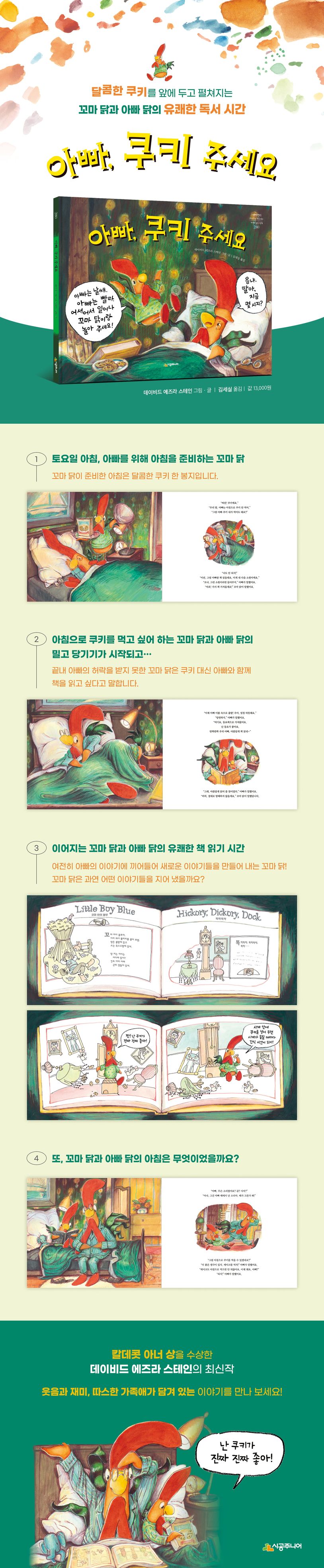 토요일 아침, 일찍 일어난 꼬마 닭은 아침 식사로 쿠키가 먹고 싶다. 그러기 위해서는 먼저 아빠 닭의 허락을 받아야 한다. 얼마 후 꼬마 닭은 자고 있는 아빠를 깨워 준비해 온 아침 식사를 내민다. 그건 바로 쿠키! 아침 식사로 쿠키를 먹고 싶지 않다는 아빠 닭에게 꼬마 닭은 아빠 대신 쿠키를 먹어도 되냐고 물어보지만 아빠 닭은 허락하지 않는다. 그럼 함께 동요책을 읽자는 꼬마 닭의 제안에 아빠 닭은 하는 수 없이 책을 읽어 주고, 아빠가 책을 읽는 순간순간 꼬마 닭이 끼어들어 쿠키와 관련된 이야기들을 지어낸다. 과연 꼬마 닭은 아침으로 쿠키를 먹을 수 있을까?