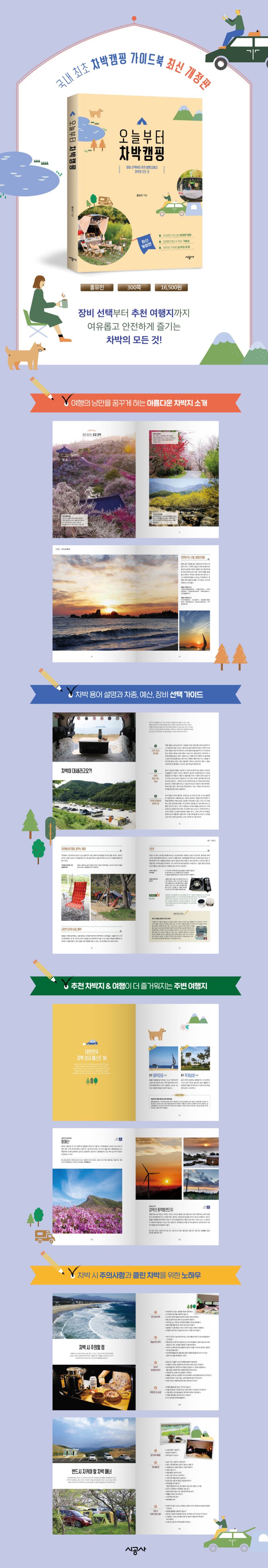 『오늘부터 차박캠핑』은 용어 설명과 차종 및 장비 선택 등의 기초 정보와 장소 선택의 노하우 및 베스트 차박 성지 등을 소개하며 차박 입문자를 위한 단 하나의 가이드북으로 사랑받았다. 새롭게 돌아온 이번 개정판에서는 여행을 꿈꾸게 하는 아름다운 사진과 드라이브하기 좋은 길, 충청권·호남권·영남권의 추천 차박지를 보강하며 여행자의 선택지를 넓혔다.