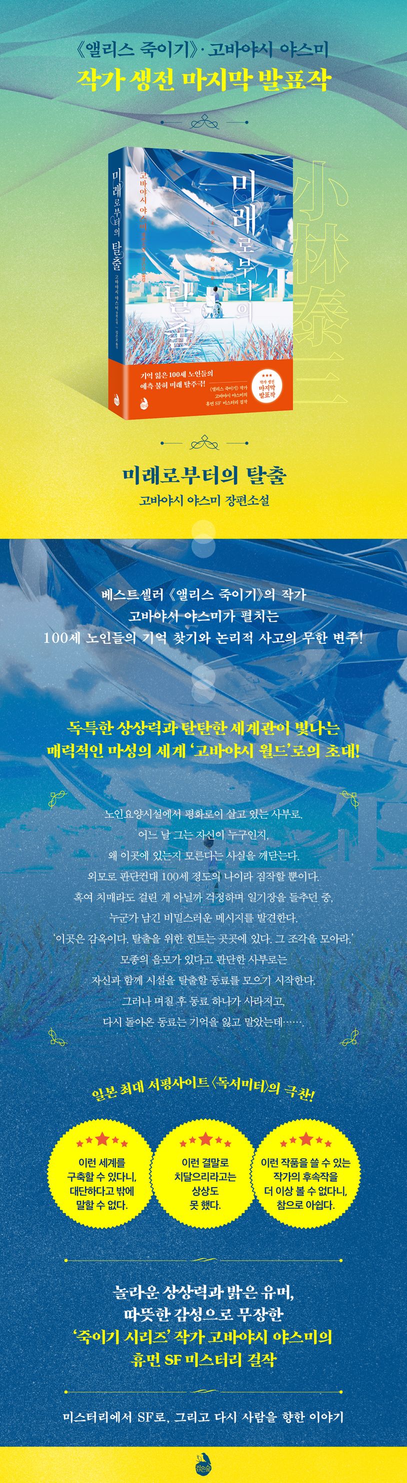 노인요양시설에서 평화로이 살고 있는 사부로. 어느 날 그는 자신이 누구인지, 왜 이곳에 있는지 모른다는 사실을 깨닫는다. 외모로 판단컨대 100세 정도의 나이라 짐작할 뿐이다. 혹여 치매라도 걸린 게 아닐까 걱정하며 일기장을 들추던 중, 누군가 남긴 비밀스러운 메시지를 발견한다. ‘이곳은 감옥이다. 탈출을 위한 힌트는 곳곳에 있다. 그 조각을 모아라.’ 모종의 음모가 있다고 판단한 사부로는 자신과 함께 시설을 탈출할 동료를 모으기 시작한다. 그러나 며칠 후 동료 하나가 사라지고, 다시 돌아온 동료는 기억을 잃고 말았는데…….