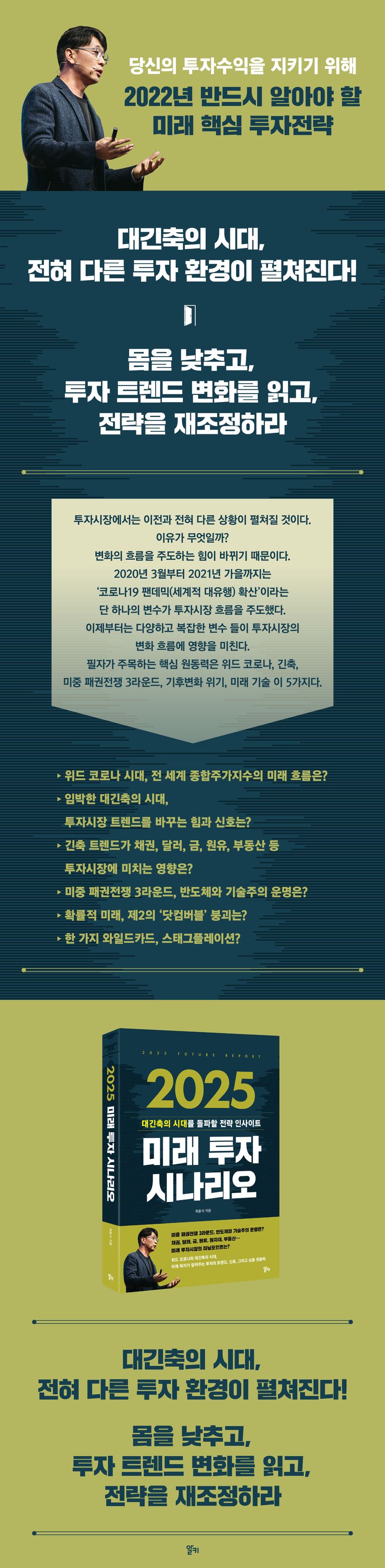 한국과 아시아를 대표하는 미래학자 최윤식 박사는 신간 《2025 미래 투자 시나리오》에서 이 같은 질문에 답하고 위드 코로나와 긴축의 시대를 지혜롭게 돌파할 투자 전략 인사이트를 제시한다. 그는 이제 투자시장에서는 이전과 전혀 다른 상황이 펼쳐질 것이라고 말한다. 이유가 무엇인가? 변화의 흐름을 주도하는 힘이 바뀌기 때문이다. 2020년부터 2021년 가을, 아니 적어도 현재까지는 ‘코로나19 팬데믹 확산’이라는 단 하나의 변수가 투자시장의 흐름을 주도했다. 하지만 이제부터는 다양하고 복잡한 변수들이 투자시장 흐름에 영향을 미친다. 저자가 주목하는 그 핵심 원동력은 다섯 가지다. 위드 코로나, 긴축, 미중 패권전쟁 3라운드, 기후변화 위기, 미래 기술.