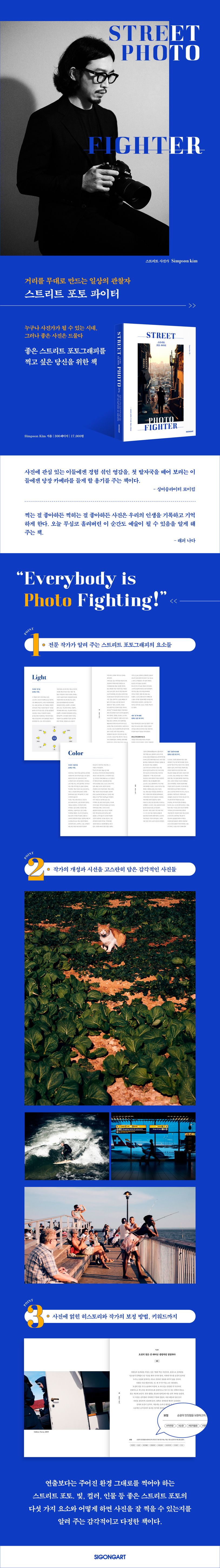 스튜디오의 조명이 아닌 자연광, 모델이 아닌 일반인, 연출이 아니라 자연 그대로. 스트리트 포토그래피의 매력은 우연의 운명성에 있다. 사진이 문자 기록보다 우선시되는 오늘날, 모든 개인은 스트리트 사진가다. 무수히 많은 해시태그 가운데 우리 눈을 사로잡는 한 장의 사진에 담긴 비밀은 무엇일까? 『스트리트 포토 파이터』는 ‘스트리트 포토그래피’라는 단어가 생경했던 시절부터 10여 년 넘게 사진을 찍어 온 스트리트 사진가 Simpson Kim의 사진들과 그가 길에서 터득한 노하우를 담은 책이다. 저자의 감각적인 사진과 짤막하지만 울림 있는 메시지는 어떤 이론보다 명쾌하고 여운이 길다.