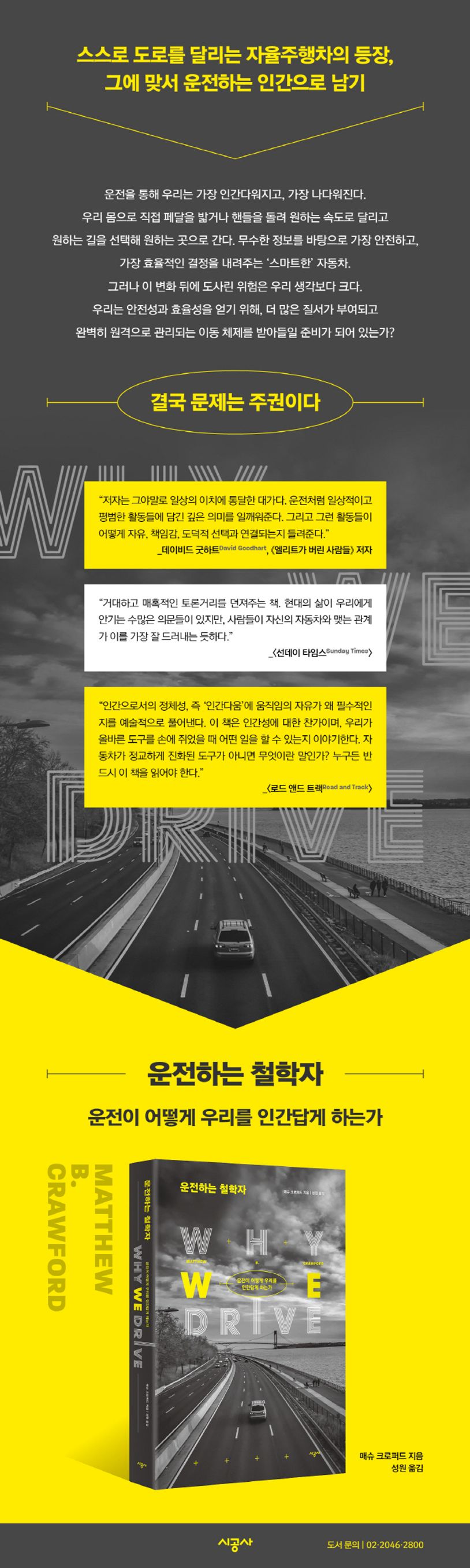 무수한 정보를 바탕으로 가장 안전하고, 가장 효율적인 결정을 내려주는 ‘스마트한’ 자동차. 그러나 이 변화 뒤에 도사린 위험은 우리 생각보다 크다. 우리는 안전성과 효율성을 얻기 위해, 더 많은 질서가 부여되고 완벽히 원격으로 관리되는 이동 체제를 받아들일 준비가 되어 있는가? 이 책 속에서, 저자는 운전을 단순한 행위로 보는 데 그치지 않고 그것을 통해 인간성, 윤리와 신뢰, 책임과 권리를 향한 철학적 탐구로 나아간다.