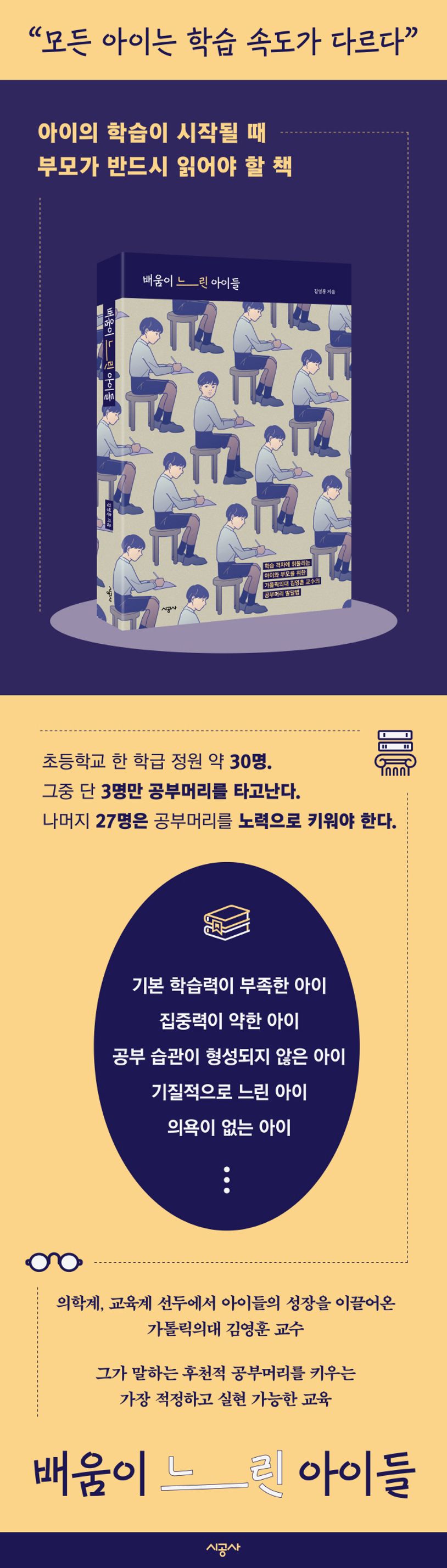 《배움이 느린 아이들》은 공부머리를 갖고 태어나지 않았거나 공부 정서가 형성되지 않은, 대부분의 아이들을 위한 책이다. 그래서 이 책을 한 문장으로 표현한다면 이렇게 말할 수 있다. “아이의 학습이 시작될 때 부모가 반드시 읽어야 할 교육서.” 이 책은 아이들의 학습력이 가장 크게 발달하는 취학전기부터 초등학교 시기에 아이들 두뇌 발달 단계에 따른 공부법, 학습을 저해하는 문제들의 해결법, 아이 학습에 관한 부모들의 올바른 심리 형성 방법을 제시하고, 부모와 아이가 각자의 속도, 환경에 발맞춰 최적의 학습 능력을 기르도록 이끈다.