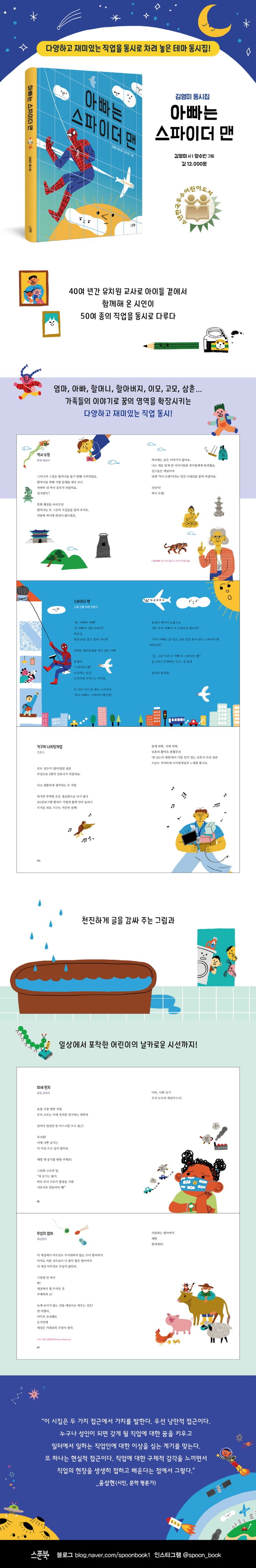 1994년 〈광주매일신문〉 신춘문예(소설)와 2008년 〈한국일보〉 신춘문예(동시)에 당선되며 오로지 어린이를 위한 글쓰기에 매진해 온 김영미 시인의 동시집 《아빠는 스파이더 맨》이 출간되었다. 《아빠는 스파이더 맨》은 40여 년간 유치원 교사로 지내며 어린이들과 가까이에서 함께해 온 시인이 다양한 직업의 세계를 동시로 다룬 이른바 ‘직업 동시집’이다. 이 동시집을 따라 경쾌한 발걸음으로 한 장 한 장 페이지를 넘기며 직업들을 탐색하는 놀이는 유쾌하고 즐겁다. 한 발 한 발 신중하게, 때로는 두리번두리번 한눈도 팔아 가며, 시인이 펼쳐 놓은 직업의 세계를 향한 소풍을 마치면, 다양한 일터에서 자긍심을 가지고 일하는 따뜻한 가족들을 만날 수 있으니 독자들로서는 설레고 반가운 기회를 갖는 셈이다.
