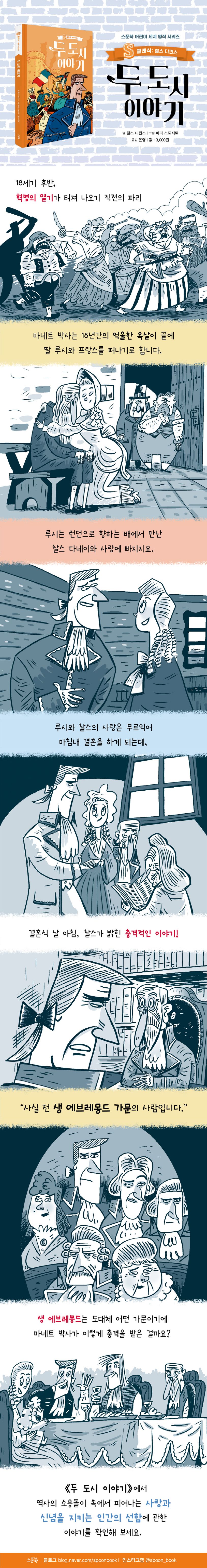 마네트 박사는 의사로서 신념과 정의를 지키다가 바스티유 감옥에 갇힙니다. 18년간의 억울한 옥살이 끝에 석방된 마네트는 자신을 찾아온 딸 루시와 함께 영국으로 향하면서 찰스 다네이라는 남자와 만나지요. 루시와 찰스는 사랑에 빠지고, 수많은 고비를 함께 헤쳐 나갑니다. 이 작품에서 우리는 정의롭고 선한 여러 인물을 보게 됩니다. 신념을 지키다 감옥에 갇히지만 자신의 행동을 후회하지 않는 마네트 박사, 따뜻한 마음씨로 주변 사람들의 마음을 치유해 주는 다정한 루시 마네트, 가문의 악행을 참다못해 이름을 버리고 떠났지만, 가문의 잘못을 바로잡기 위해 위험을 감수하는 찰스 다네이, 사랑하는 사람들의 행복을 위해 기꺼이 희생하는 시드니 카턴까지. 인간이기에 가능한 행동 속에서 우리는 큰 감동과 교훈을 얻을 수 있습니다.
