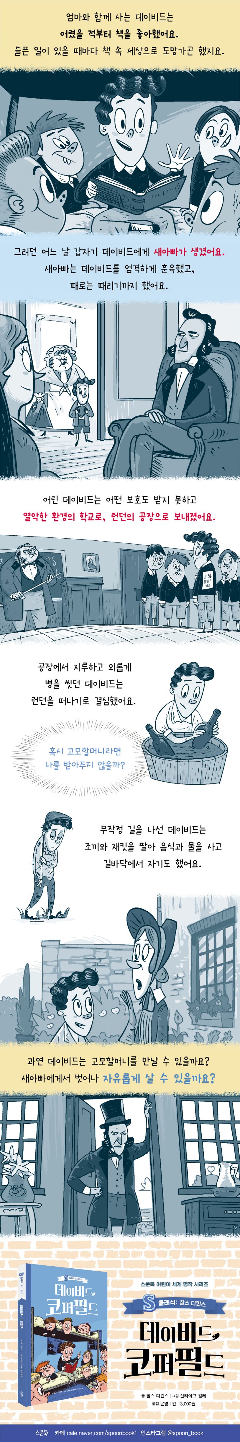 아버지를 여의고 태어난 아이 데이비드 코퍼필드. 어머니의 재혼으로 맞이하게 된 새아버지는 데이비드를 엄격하게 훈육했고, 때로는 그를 때리기까지 했어요. 데이비드의 어머니는 새아버지의 학대로부터 그를 지켜주지 못했어요. 어린 데이비드는 어떤 보호도 받지 못한 채 열악한 환경의 학교로, 런던의 공장으로 보내집니다. 하지만 이런 절망적인 상황 속에서도 데이비드는 무력하게 주저앉아 있지 않았어요. 그는 공장을 벗어나 무작정 고모할머니를 찾아 나섭니다. 이후에도 몇 번의 좌절을 겪지만 데이비드는 희망을 잃지 않아요. 풍랑이 휘몰아쳐도 중심을 잃지 않고 언제나 자신의 삶 가운데 꼿꼿이 서서 견디고 이겨냈지요. 그런 용기와 우직함 덕분에 데이비드는 마침내 소설가로 큰 성공을 거두고 교활한 유라이어 힙으로부터 사랑하는 아그네스도 지킬 수 있었답니다.