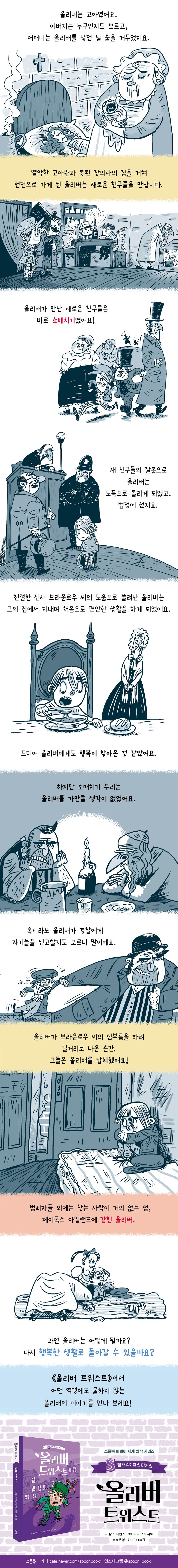 올리버는 고아였어요. 아버지는 누군지도 모르고 어머니는 올리버를 낳던 날 숨을 거두었거든요. 고아원에서의 생활은 너무나 힘들었어요. 하루 종일 일하면서 먹는 거라곤 희멀건 죽 한 국자뿐이었지요. 올리버는 나서서 음식을 더 달라고 했어요. 하지만 정해진 양 외의 더 많은 음식을 요구했다는 이유로 올리버는 장의사에게 팔려 가게 되었지요. 고아원보다는 조금 나았지만 비참한 생활이라는 점에는 변함이 없었어요. 결국 올리버는 그 집에서 도망 나와 무작정 런던으로 향했어요. 그러다 소매치기 무리와 생활하게 되지요.
