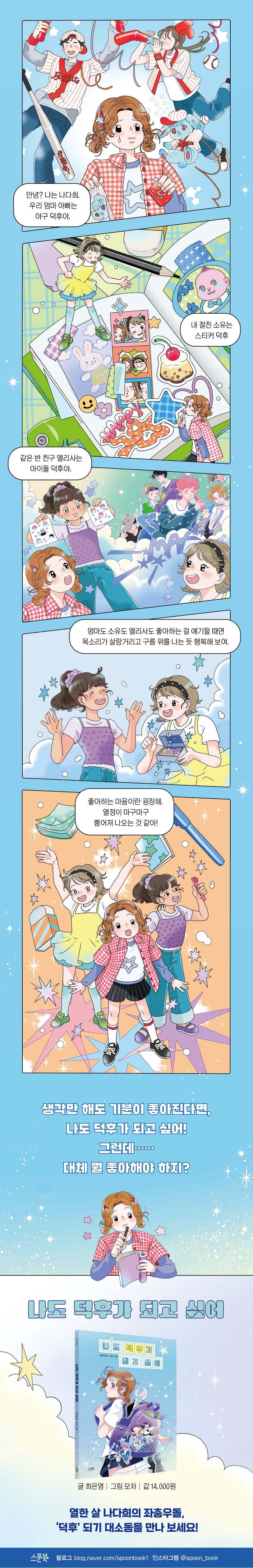 엄마 아빠는 야구 덕분에 결혼했다고 말할 만큼 야구를 좋아해요. 그래서 다희는 프로 야구가 진행되는 시즌이면 늘 야구장에 갔어요. 하지만 이제 야구장에는 그만 가고 싶어요. 용기 내서 솔직하게 마음을 얘기했더니 엄마 아빠도 야구장에 안 간다지 뭐예요. 다희를 혼자 집에 둘 수 없다면서요. 막막한 다희에게 단짝인 소유가 손을 내밀었어요. 엄마 아빠가 야구장에 간 날 소유, 엘리사와 함께 하루를 보낸 다희는 무언가를 좋아하고 싶어졌어요. 덕후가 되고 싶어진 거예요. 그때부터 다희는 주변 사람들을 관찰하며 덕질 대상을 찾기 시작했어요. 소유는 스티커 덕후, 엘리사는 아이돌 덕후에요. 하지만 다희는 뭘 좋아해야 할지 모르겠어요. 과연 다희는 바라는 대로 덕후가 될 수 있을까요?
