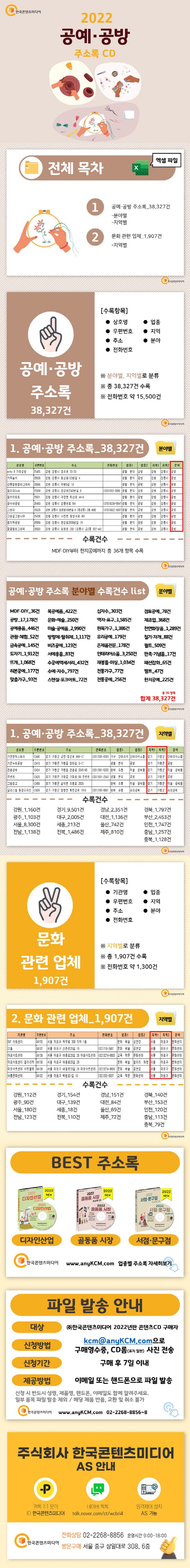 1.공예·공방주소록_3만8327건수록항목:상호명,우편번호,주소,전화번호,업종,지역,분야수록건수:전화번호약15,500건●분야별①MDF·DIY_36건②공방_17,178건③공예용품_446건④관람·체험_52건⑤금속공예_145건⑥도자기_1,912건⑦뜨개_1,068건⑧리본공예_177건⑨맞춤가구_93건⑩목공예품_422건⑪문화·예술_250건⑫미술·공예품_2,990건⑬방향제·탈취제_1,117건⑭비즈공예_123건⑮서예용품_83건?수공예액세서리_432건?수예·자수_797건?스텐실·포크아트_72건?십자수_303건?액자·표구_1,585건?원목가구_1,386건?유리공예_179건?은제품전문_178건?인테리어소품_3,250건?재봉틀·미싱_1,034건?전통가구_77건?전통공예_256건?점토공예_78건?제조업_368건?천연화장품_1,289건?칠기·자개_88건?퀼트_509건?판촉·기념품_17건?패션잡화_65건?펠트_47건?한지공예_225건●지역별①강원_1,160건②경기_9,501건③경남_2,351건④경북_1,797건⑤광주_1,103건⑥대구_2,005건⑦대전_1,136건⑧부산_2,453건⑨서울_8,300건⑩세종_213건⑪울산_742건⑫인천_1,747건⑬전남_1,138건⑭전북_1,486건⑮제주_810건?충남_1,257건?충북_1,128건2.문화관련업체_1,907건수록항목:기관명,우편번호,주소,전화번호,업종,지역,분야수록건수:전화번호약1,300건●지역별①강원_112건②경기_154건③경남_151건④경북_140건⑤광주_90건⑥대구_139건⑦대전_84건⑧부산_153건⑨서울_180건⑩세종_18건⑪울산_69건⑫인천_120건⑬전남_123건⑭전북_110건⑮제주_72건?충남_113건?충북_79건