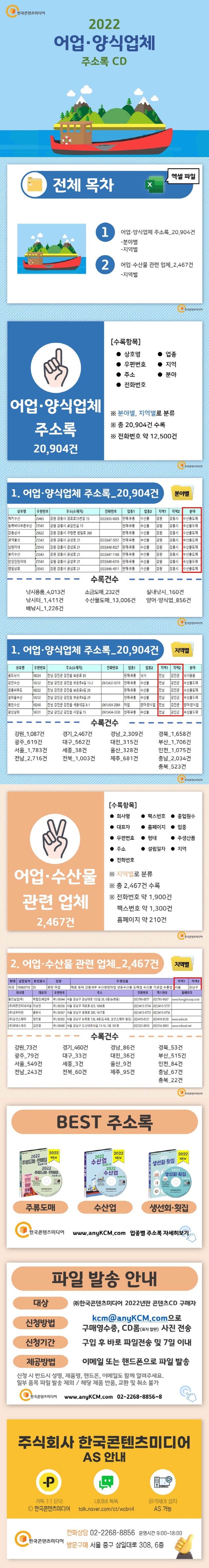 ▶〈2022어업·양식업체주소록CD〉란?어업·양식업체주소록을분야별,지역별로20,904건,어업·수산물관련업체주소록을지역별로2,467건을수록했습니다.※엑셀파일로사용자가편리하게수정·편집·출력할수있습니다〈책임의한계와법적고지〉·본제품의저작권및판권은주식회사한국콘텐츠미디어에있으며저작권법및소프트웨어법에의해보호받는라이센스저작물이므로무단복제및무단전재를금합니다.·본제품의자료수집한계로인해그정확도가일부제한됨을알려드립니다.·본제품을활용하여영리성광고정보전송을하는경우정보이용촉진및정보보호등에관한법률제50조에따른준수사항을반드시지켜야하며이를어길경우관련법에따라처벌받을수있습니다.·본제품사용에따른결과및판단은민형사를포함한일체가전적으로사용자(사)에게책임이있습니다.·본제품은전자출판물로서해당법령및실천요강을준수합니다.
