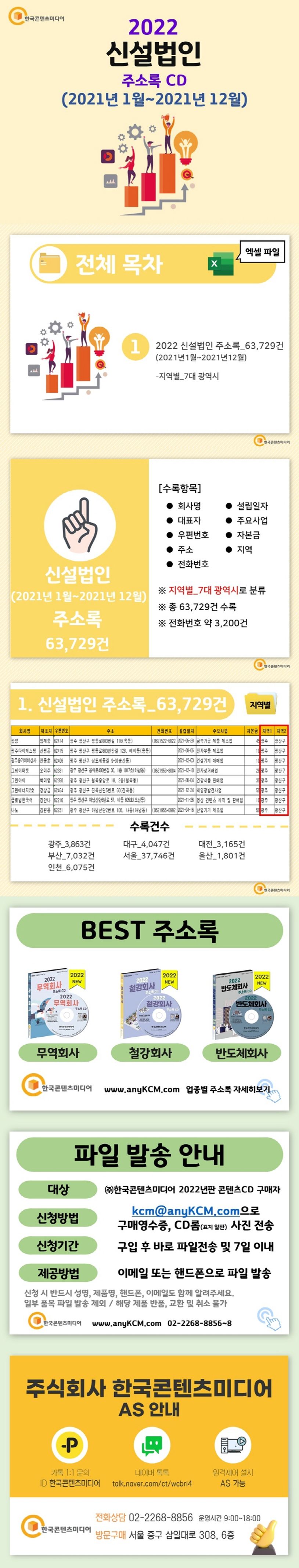 ▶〈2022신설법인주소록CD(2021년1월~2021년12월)〉란?2021년에설립된신설법인기업체주소록을7대광역시지역별로63,729건을수록했습니다.※엑셀파일로사용자가편리하게수정·편집·출력할수있습니다〈책임의한계와법적고지〉·본제품의저작권및판권은주식회사한국콘텐츠미디어에있으며저작권법및소프트웨어법에의해보호받는라이센스저작물이므로무단복제및무단전재를금합니다.·본제품의자료수집한계로인해그정확도가일부제한됨을알려드립니다.·본제품을활용하여영리성광고정보전송을하는경우정보이용촉진및정보보호등에관한법률제50조에따른준수사항을반드시지켜야하며이를어길경우관련법에따라처벌받을수있습니다.·본제품사용에따른결과및판단은민형사를포함한일체가전적으로사용자(사)에게책임이있습니다.·본제품은전자출판물로서해당법령및실천요강을준수합니다.