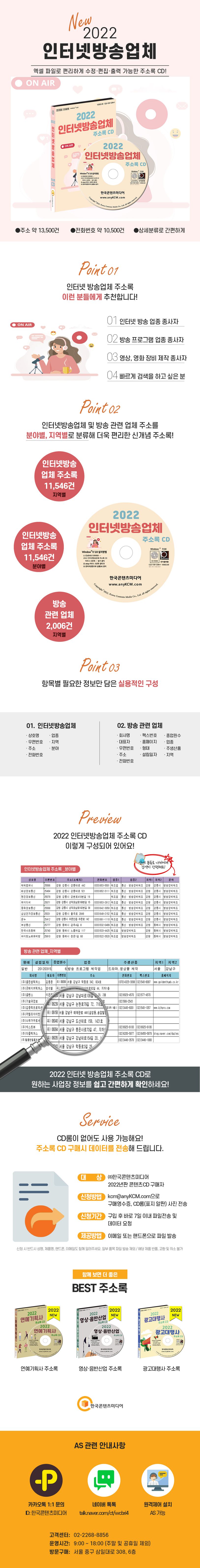 ▶〈2022인터넷방송업체주소록CD〉란?인터넷방송업체주소록을분야별,지역별로11,546건,방송관련업체주소록을지역별로2,006건을수록했습니다.※엑셀파일로사용자가편리하게수정·편집·출력할수있습니다〈책임의한계와법적고지〉·본제품의저작권및판권은주식회사한국콘텐츠미디어에있으며저작권법및소프트웨어법에의해보호받는라이센스저작물이므로무단복제및무단전재를금합니다.·본제품의자료수집한계로인해그정확도가일부제한됨을알려드립니다.·본제품을활용하여영리성광고정보전송을하는경우정보이용촉진및정보보호등에관한법률제50조에따른준수사항을반드시지켜야하며이를어길경우관련법에따라처벌받을수있습니다.·본제품사용에따른결과및판단은민형사를포함한일체가전적으로사용자(사)에게책임이있습니다.·본제품은전자출판물로서해당법령및실천요강을준수합니다.