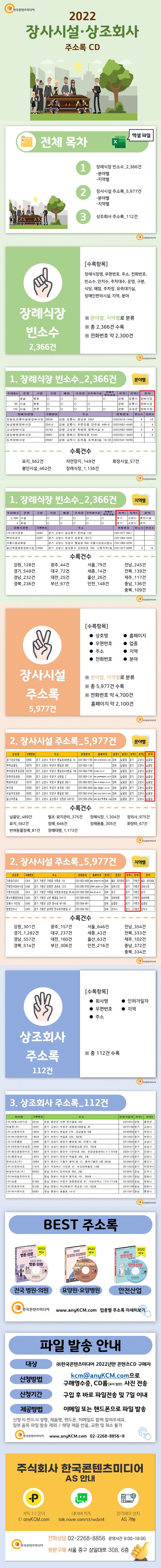 ▶〈2022장사시설·상조회사주소록CD〉란?장례식장빈소수를분야별,지역별로2,366건,장사시설주소록을분야별,지역별로5,977건,상조회사주소록을112건을수록했습니다.※엑셀파일로사용자가편리하게수정·편집·출력할수있습니다.〈책임의한계와법적고지〉·본제품의저작권및판권은주식회사한국콘텐츠미디어에있으며저작권법및소프트웨어법에의해보호받는라이센스저작물이므로무단복제및무단전재를금합니다.·본제품의자료수집한계로인해그정확도가일부제한됨을알려드립니다.·본제품을활용하여영리성광고정보전송을하는경우정보이용촉진및정보보호등에관한법률제50조에따른준수사항을반드시지켜야하며이를어길경우관련법에따라처벌받을수있습니다.·본제품사용에따른결과및판단은민형사를포함한일체가전적으로사용자(사)에게책임이있습니다.·본제품은전자출판물로서해당법령및실천요강을준수합니다.