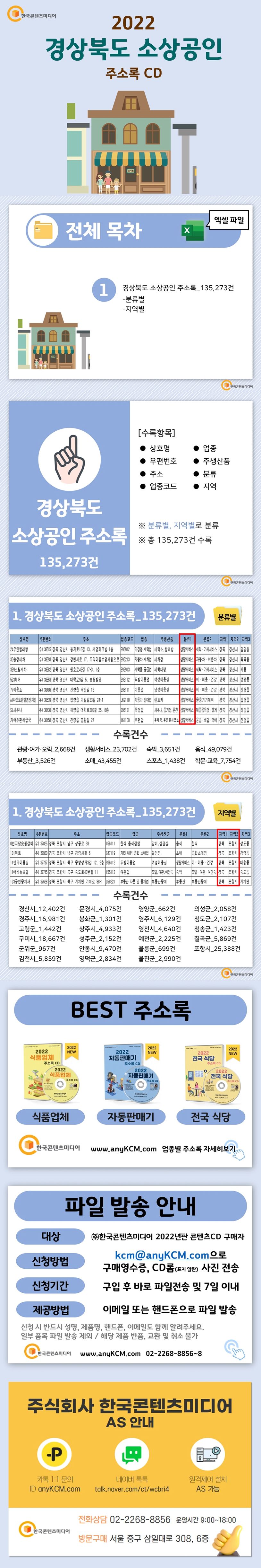 ▶〈2022경상북도소상공인주소록CD〉란?경상북도소상공인주소록을분류별,지역별로135,273건을수록했습니다.※엑셀파일로사용자가편리하게수정·편집·출력할수있습니다.〈책임의한계와법적고지〉·본제품의저작권및판권은주식회사한국콘텐츠미디어에있으며저작권법및소프트웨어법에의해보호받는라이센스저작물이므로무단복제및무단전재를금합니다.·본제품의자료수집한계로인해그정확도가일부제한됨을알려드립니다.·본제품을활용하여영리성광고정보전송을하는경우정보이용촉진및정보보호등에관한법률제50조에따른준수사항을반드시지켜야하며이를어길경우관련법에따라처벌받을수있습니다.·본제품사용에따른결과및판단은민형사를포함한일체가전적으로사용자(사)에게책임이있습니다.·본제품은전자출판물로서해당법령및실천요강을준수합니다.