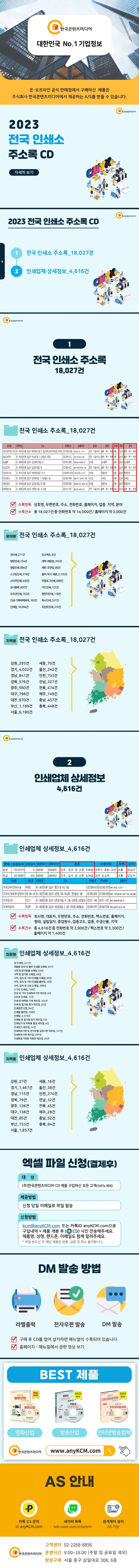 1.전국인쇄소주소록_18,027건수록항목:상호명,우편번호,주소,전화번호,홈페이지,업종,지역,분야수록건수:총18,027건중전화번호약14,000건/홈페이지약5,000건●분야별①경인쇄_211건②명판인쇄_224건③명함인쇄_894건④스크린인쇄_579건⑤스티커인쇄_630건⑥실사출력_602건⑦오프셋인쇄_153건⑧인쇄·기록매체복제_165건⑨인쇄업_10,294건⑩잉크제조_6건⑪제책·제본업_262건⑫제판·조판업_80건⑬출력·복사·제본_2,135건⑭카달로그인쇄_699건⑮카드인쇄_123건16.캘린더인쇄_118건17.특수인쇄_537건18.프린트인쇄_315건●지역별①강원_293건②경기_4,022건③경남_841건④경북_576건⑤광주_560건⑥대구_796건⑦대전_670건⑧부산_1,189건⑨서울_6,180건⑩세종_70건⑪울산_242건⑫인천_733건⑬전남_327건⑭전북_474건⑮제주_149건16.충남_457건17.충북_448건2.인쇄업체상세정보_4,616건수록항목:회사명,대표자,우편번호,주소,전화번호,팩스번호,홈페이지,형태,설립일자,종업원수,업종코드,업종,주생산품,지역수록건수:총4,616건중전화번호약3,900건/팩스번호약3,300건/홈페이지약1,400건●업종별①경인쇄업_241건②생활용포장및출판인쇄물도매업_97건③서적및문구용품소매업_53건④서적및잡지류소매업_59건⑤서적,잡지및기타인쇄물도매업_95건⑥서적,잡지및기타인쇄물출판업_10건⑦서적,잡지및신문도매업_398건⑧스크린인쇄업_136건⑨연성및기타인쇄회로기판제조업_6건⑩오프셋인쇄업_12건⑪인쇄및제책용기계제조업_103건⑫인쇄및필기용원지제조업_22건⑬인쇄관련산업_94건⑭인쇄물출판업_158건⑮인쇄업_2,473건16.인쇄용및필기용원지제조업_4건17.인쇄잉크및회화용물감제조업_4건18.인쇄잉크제조업_74건19.인쇄회로기판및전자부품실장기판제조업_147건20.인쇄회로기판제조업_385건21.인쇄회로기판용적층판제조업_45건●지역별①강원_27건②경기_1,467건③경남_115건④경북_79건⑤광주_126건⑥대구_138건⑦대전_85건⑧부산_153건⑨서울_1,857건⑩세종_16건⑪울산_38건⑫인천_274건⑬전남_32건⑭전북_45건⑮제주_28건16.충남_52건17.충북_84건