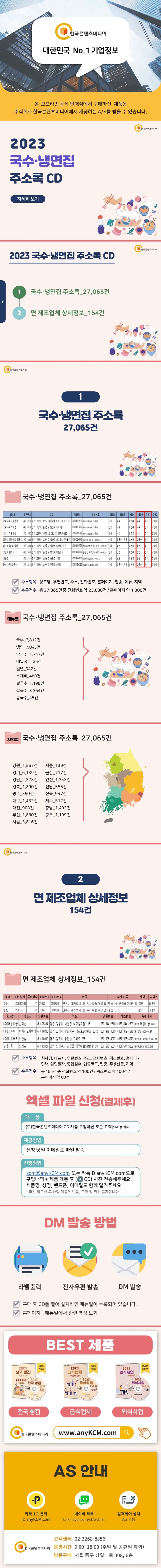 ▶〈2023국수·냉면집주소록CD〉란?국수·냉면집주소록을메뉴별,지역별로27,065건,면제조업체상세정보를154건을수록했습니다.※엑셀파일로사용자가편리하게수정·편집·출력할수있습니다.〈책임의한계와법적고지〉·본제품의저작권및판권은주식회사한국콘텐츠미디어에있으며저작권법및소프트웨어법에의해보호받는라이센스저작물이므로무단복제및무단전재를금합니다.·본제품의자료수집한계로인해그정확도가일부제한됨을알려드립니다.·본제품을활용하여영리성광고정보전송을하는경우정보이용촉진및정보보호등에관한법률제50조에따른준수사항을반드시지켜야하며이를어길경우관련법에따라처벌받을수있습니다.·본제품사용에따른결과및판단은민형사를포함한일체가전적으로사용자(사)에게책임이있습니다.·본제품은전자출판물로서해당법령및실천요강을준수합니다.