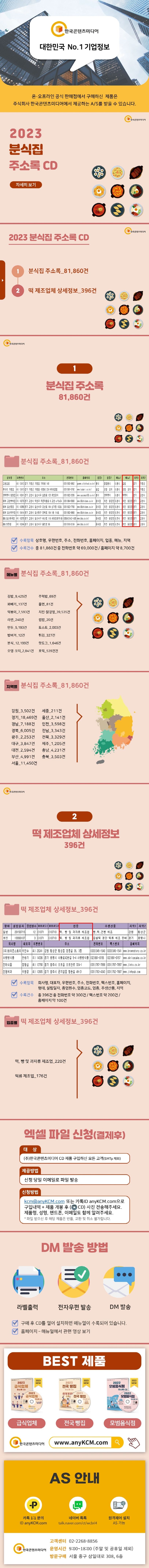 ▶〈2023분식집주소록CD〉란?분식집주소록을메뉴별,지역별로81,860건,떡제조업체상세정보를업종별로396건을수록했습니다.※엑셀파일로사용자가편리하게수정·편집·출력할수있습니다.〈책임의한계와법적고지〉·본제품의저작권및판권은주식회사한국콘텐츠미디어에있으며저작권법및소프트웨어법에의해보호받는라이센스저작물이므로무단복제및무단전재를금합니다.·본제품의자료수집한계로인해그정확도가일부제한됨을알려드립니다.·본제품을활용하여영리성광고정보전송을하는경우정보이용촉진및정보보호등에관한법률제50조에따른준수사항을반드시지켜야하며이를어길경우관련법에따라처벌받을수있습니다.·본제품사용에따른결과및판단은민형사를포함한일체가전적으로사용자(사)에게책임이있습니다.·본제품은전자출판물로서해당법령및실천요강을준수합니다.