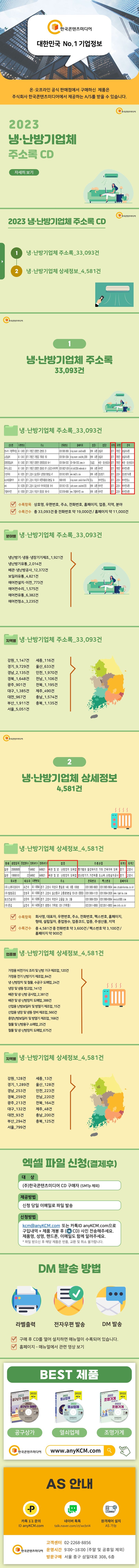 1.냉·난방기업체주소록_33,093건수록항목:상호명,우편번호,주소,전화번호,홈페이지,업종,지역,분야수록건수:총33,093건중전화번호약19,000건/홈페이지약11,000건●분야별①냉난방기·냉동·냉장기기제조_1,921건②냉난방기유통_2,014건③배관·냉난방공사_12,372건④보일러유통_4,821건⑤에어컨설치·이전_773건⑥에어컨수리_1,575건⑦에어컨유통_6,382건⑧에어컨청소_3,235건●지역별①강원_1,147건②경기_9,729건③경남_2,135건④경북_1,648건⑤광주_901건⑥대구_1,385건⑦대전_967건⑧부산_1,911건⑨서울_5,051건⑩세종_116건⑪울산_633건⑫인천_1,970건⑬전남_1,106건⑭전북_1,195건⑮제주_490건⑯충남_1,574건⑰충북_1,135건2.냉·난방기업체상세정보_4,581건수록항목:회사명,대표자,우편번호,주소,전화번호,팩스번호,홈페이지,형태,설립일자,종업원수,업종코드,업종,주생산품,지역수록건수:총4,581건중전화번호약3,600건/팩스번호약3,100건/홈페이지약900건●업종별①가정용비전기식조리및난방기구제조업_120건②가정용전기난방기기제조업_84건③냉·난방장치및철물,수공구도매업_24건④냉장및냉동창고업_141건⑤배관및냉·난방공사업_2,381건⑥배관및냉·난방장치도매업_388건⑦산업용난방보일러및방열기제조업_15건⑧산업용냉장및냉동장비제조업_560건⑨중앙난방보일러및방열기제조업_168건⑩철물및난방용구소매업_25건⑪철물및냉·난방장치도매업_675건●지역별①강원_128건②경기_1,289건③경남_253건④경북_259건⑤광주_213건⑥대구_132건⑦대전_93건⑧부산_294건⑨서울_799건⑩세종_13건⑪울산_128건⑫인천_223건⑬전남_220건⑭전북_164건⑮제주_48건⑯충남_200건⑰충북_125건