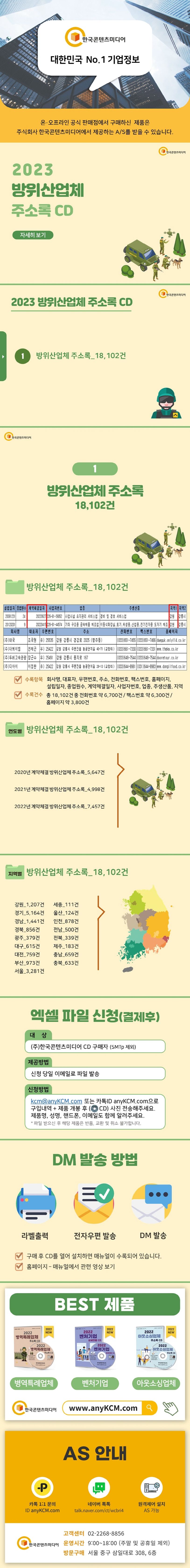 ▶〈2023방위산업체주소록CD〉란?방위산업체주소록을연도별,지역별로18,102건을수록했습니다.※엑셀파일로사용자가편리하게수정·편집·출력할수있습니다.〈책임의한계와법적고지〉·본제품의저작권및판권은주식회사한국콘텐츠미디어에있으며저작권법및소프트웨어법에의해보호받는라이센스저작물이므로무단복제및무단전재를금합니다.·본제품의자료수집한계로인해그정확도가일부제한됨을알려드립니다.·본제품을활용하여영리성광고정보전송을하는경우정보이용촉진및정보보호등에관한법률제50조에따른준수사항을반드시지켜야하며이를어길경우관련법에따라처벌받을수있습니다.·본제품사용에따른결과및판단은민형사를포함한일체가전적으로사용자(사)에게책임이있습니다.·본제품은전자출판물로서해당법령및실천요강을준수합니다.