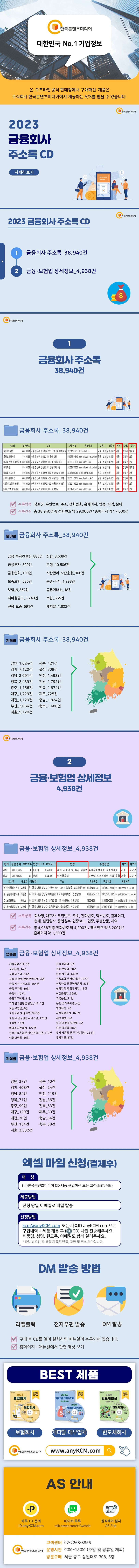 ▶〈2023금융회사주소록CD〉란?금융회사주소록을분야별,지역별로38,940건,금융·보험업상세정보를업종별,지역별로4,938건을수록했습니다.※엑셀파일로사용자가편리하게수정·편집·출력할수있습니다.〈책임의한계와법적고지〉·본제품의저작권및판권은주식회사한국콘텐츠미디어에있으며저작권법및소프트웨어법에의해보호받는라이센스저작물이므로무단복제및무단전재를금합니다.·본제품의자료수집한계로인해그정확도가일부제한됨을알려드립니다.·본제품을활용하여영리성광고정보전송을하는경우정보이용촉진및정보보호등에관한법률제50조에따른준수사항을반드시지켜야하며이를어길경우관련법에따라처벌받을수있습니다.·본제품사용에따른결과및판단은민형사를포함한일체가전적으로사용자(사)에게책임이있습니다.·본제품은전자출판물로서해당법령및실천요강을준수합니다.
