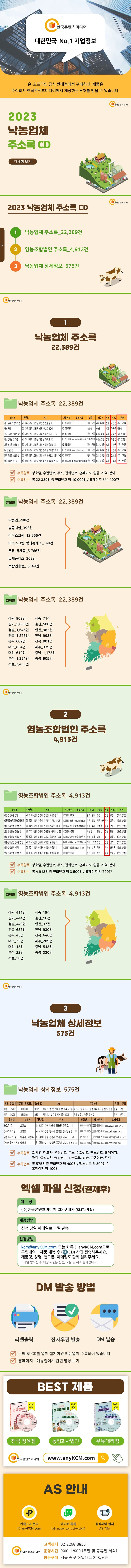 ▶〈2023낙농업체주소록CD〉란?낙농업체주소록을분야별,지역별로22,389건,영농조합법인주소록을지역별로4,913건,낙농업체상세정보를575건을수록했습니다.※엑셀파일로사용자가편리하게수정·편집·출력할수있습니다.〈책임의한계와법적고지〉·본제품의저작권및판권은주식회사한국콘텐츠미디어에있으며저작권법및소프트웨어법에의해보호받는라이센스저작물이므로무단복제및무단전재를금합니다.·본제품의자료수집한계로인해그정확도가일부제한됨을알려드립니다.·본제품을활용하여영리성광고정보전송을하는경우정보이용촉진및정보보호등에관한법률제50조에따른준수사항을반드시지켜야하며이를어길경우관련법에따라처벌받을수있습니다.·본제품사용에따른결과및판단은민형사를포함한일체가전적으로사용자(사)에게책임이있습니다.·본제품은전자출판물로서해당법령및실천요강을준수합니다.
