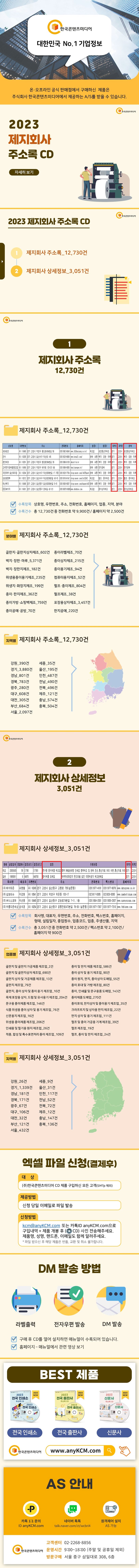 제지회사 주소록을 분야별, 지역별로 12,730건, 제지회사 상세정보를 업종별, 지역별로 3,051건을 수록했습니다.