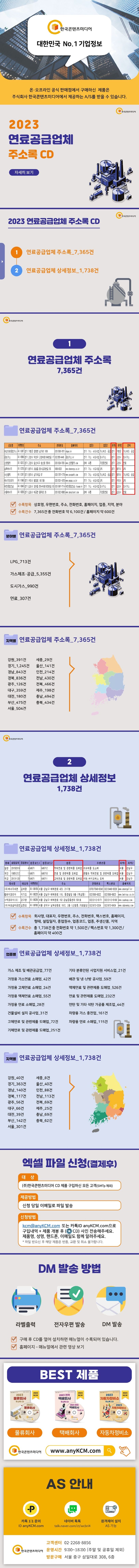 1.연료공급업체주소록_7,365건수록항목:상호명,우편번호,주소,전화번호,홈페이지,업종,지역,분야수록건수:총7,365건중전화번호약6,100건/홈페이지약600건●분야별①LPG_713건②가스제조·공급_5,355건③도시가스_990건④연료_307건●지역별①강원_391건②경기_1,245건③경남_843건④경북_836건⑤광주_126건⑥대구_359건⑦대전_180건⑧부산_475건⑨서울_504건⑩세종_29건⑪울산_141건⑫인천_214건⑬전남_430건⑭전북_466건⑮제주_198건⑯충남_494건⑰충북_434건2.연료공급업체상세정보_1,738건수록항목:회사명,대표자,우편번호,주소,전화번호,팩스번호,홈페이지,형태,설립일자,종업원수,업종코드,업종,주생산품,지역수록건수:총1,738건중전화번호약1,500건/팩스번호약1,300건/홈페이지약400건●업종별①가스제조및배관공급업_77건②가정용가스연료소매업_42건③가정용고체연료소매업_24건④가정용액체연료소매업_55건⑤가정용연료소매업_28건⑥건물설비설치공사업_31건⑦고체연료및관련제품도매업_72건⑧기체연료및관련제품도매업_251건⑨기타분류안된사업지원서비스업_21건⑩배관및냉·난방공사업_59건⑪액체연료및관련제품도매업_526건⑫연료및관련제품도매업_232건⑬연탄및기타석탄가공품제조업_44건⑭차량용가스충전업_161건⑮차량용연료소매업_115건●지역별①강원_40건②경기_363건③경남_140건④경북_117건⑤광주_56건⑥대구_66건⑦대전_39건⑧부산_142건⑨서울_301건⑩세종_8건⑪울산_40건⑫인천_88건⑬전남_113건⑭전북_69건⑮제주_25건⑯충남_69건⑰충북_62건