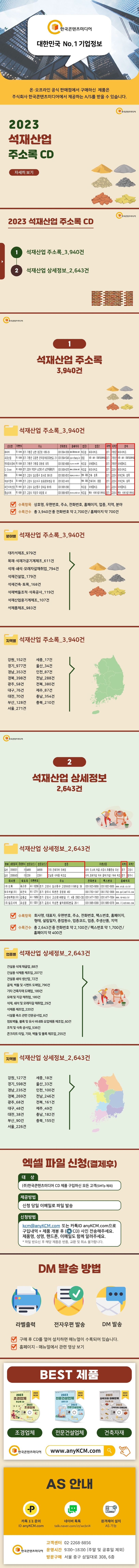 1.석재산업주소록_3,940건수록항목:상호명,우편번호,주소,전화번호,홈페이지,업종,지역,분야수록건수:3,940건중전화번호약2,700건/홈페이지약700건●분야별①대리석제조_979건②목재·석재가공기계제조_611건③석재·쇄석·모래자갈채취업_794건④석재건설업_179건⑤석재건축·토목_168건⑥석재벽돌조적·석축공사_119건⑦석재산업용기계제조_107건⑧석제품제조_983건●지역별①강원_152건②경기_977건③경남_353건④경북_398건⑤광주_58건⑥대구_76건⑦대전_70건⑧부산_128건⑨서울_271건⑩세종_17건⑪울산_34건⑫인천_87건⑬전남_288건⑭전북_380건⑮제주_87건⑯충남_354건⑰충북_210건2.석재산업상세정보_2,643건수록항목:회사명,대표자,우편번호,주소,전화번호,팩스번호,홈페이지,형태,설립일자,종업원수,업종코드,업종,주생산품,지역수록건수:총2,643건중전화번호약2,100건/팩스번호약1,700건/홈페이지약400건●업종별①건설용석재채굴업_88건②건설용석제품제조업_207건③건설용쇄석생산업_72건④골재,벽돌및시멘트도매업_790건⑤기타건축자재도매업_189건⑥모래및자갈채취업_189건⑦석재,쇄석및모래자갈채취업_29건⑧석제품제조업_220건⑨시설물축조관련전문공사업_8건⑩점토벽돌,블록및유사비내화요업제품제조업_60건⑪조적및석축공사업_536건⑫콘크리트타일,기와,벽돌및블록제조업_255건●지역별①강원_127건②경기_598건③경남_235건④경북_269건⑤광주_68건⑥대구_48건⑦대전_38건⑧부산_90건⑨서울_226건⑩세종_18건⑪울산_33건⑫인천_100건⑬전남_246건⑭전북_161건⑮제주_49건⑯충남_182건⑰충북_155건