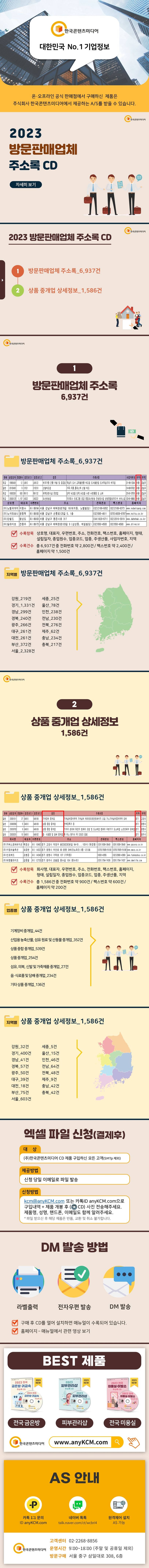 ▶〈2023방문판매업체주소록CD〉란?방문판매업체주소록을지역별로6,937건,상품중개업상세정보를업종별,지역별로1,586건을수록했습니다.※엑셀파일로사용자가편리하게수정·편집·출력할수있습니다.〈책임의한계와법적고지〉·본제품의저작권및판권은주식회사한국콘텐츠미디어에있으며저작권법및소프트웨어법에의해보호받는라이센스저작물이므로무단복제및무단전재를금합니다.·본제품의자료수집한계로인해그정확도가일부제한됨을알려드립니다.·본제품을활용하여영리성광고정보전송을하는경우정보이용촉진및정보보호등에관한법률제50조에따른준수사항을반드시지켜야하며이를어길경우관련법에따라처벌받을수있습니다.·본제품사용에따른결과및판단은민형사를포함한일체가전적으로사용자(사)에게책임이있습니다.·본제품은전자출판물로서해당법령및실천요강을준수합니다.