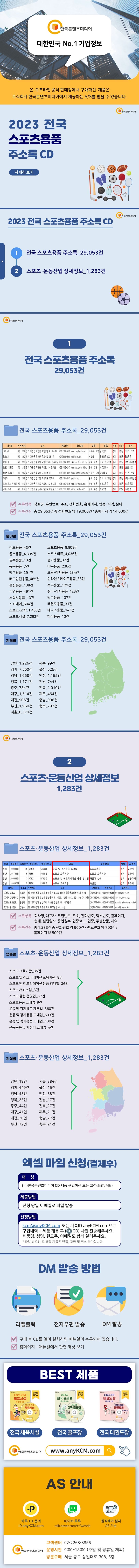 1.전국스포츠용품주소록_29,053건수록항목:상호명,우편번호,주소,전화번호,홈페이지,업종,지역,분야수록건수:총29,053건중전화번호약19,000건/홈페이지약14,000건●분야별①검도용품_43건②골프용품_4,335건③권투용품_13건④농구용품_7건⑤당구용품_291건⑥배드민턴용품_465건⑦볼링용품_138건⑧수영용품_491건⑨스쿼시용품_13건⑩스키대여_504건⑪스포츠·오락_1,456건⑫스포츠시설_7,293건⑬스포츠용품_8,808건⑭스포츠의류_4,036건⑮승마용품_32건⑯야구용품_236건⑰오락·레저용품_234건⑱인라인스케이트용품_83건⑲축구용품_129건⑳취미·레저용품_123건㉑탁구용품_137건㉒태권도용품_31건㉓테니스용품_142건㉔하키용품_13건●지역별①강원_1,226건②경기_7,560건③경남_1,668건④경북_1,171건⑤광주_784건⑥대구_1,514건⑦대전_906건⑧부산_1,960건⑨서울_6,379건⑩세종_99건⑪울산_625건⑫인천_1,155건⑬전남_744건⑭전북_1,010건⑮제주_464건⑯충남_996건⑰충북_792건2.스포츠·운동산업상세정보_1,283건수록항목:회사명,대표자,우편번호,주소,전화번호,팩스번호,홈페이지,형태,설립일자,종업원수,업종코드,업종,주생산품,지역수록건수:총1,283건중전화번호약900건/팩스번호약700건/홈페이지약500건●업종별①스포츠교육기관_85건②스포츠및레크리에이션교육기관_8건③스포츠및레크리에이션용품임대업_36건④스포츠서비스업_3건⑤스포츠클럽운영업_37건⑥스포츠용품소매업_8건⑦운동및경기용구제조업_360건⑧운동및경기용품도매업_603건⑨운동및경기용품소매업_139건⑩운동용품및자전거소매업_4건●지역별①강원_19건②경기_449건③경남_45건④경북_23건⑤광주_44건⑥대구_41건⑦대전_20건⑧부산_72건⑨서울_384건⑩울산_15건⑪인천_58건⑫전남_17건⑬전북_27건⑭제주_21건⑮충남_27건⑯충북_21건