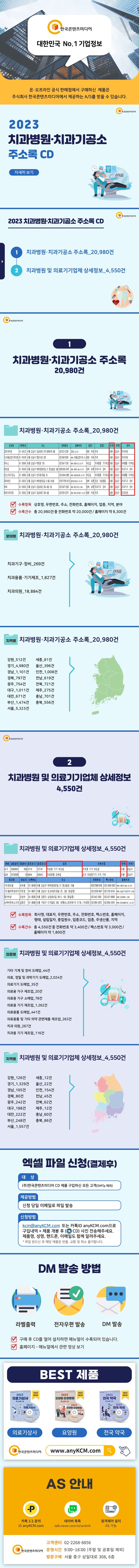 치과병원·치과기공소 주소록을 분야별, 지역별로 20,980건, 치과병원 및 의료기기업체 상세정보를 업종별, 지역별로 4,550건을 수록했습니다.