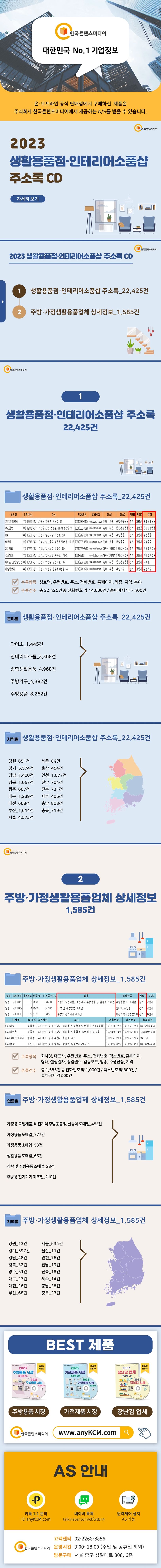 생활용품점·인테리어소품샵 주소록을 분야별, 지역별로 22,425건, 주방·가정생활용품업체 상세정보를 업종별, 지역별로 1,585건을 수록했습니다.