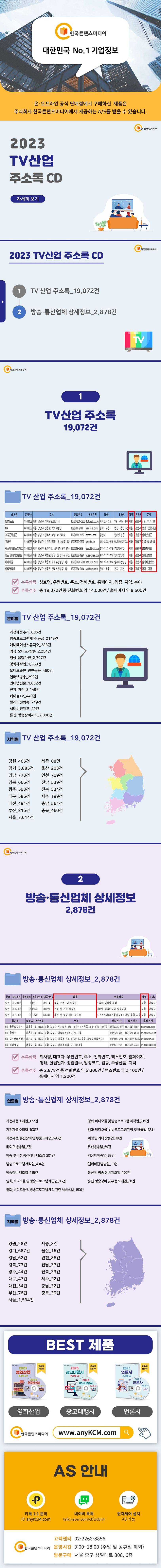 1.TV산업주소록_19,072건수록항목:상호명,우편번호,주소,전화번호,홈페이지,업종,지역,분야수록건수:총19,072건중전화번호약14,000건/홈페이지약8,500건●분야별①가전제품수리_605건②방송프로그램제작·공급_2143건③애니메이션스튜디오_288건④영상·오디오·방송_2,254건⑤영상·음향가전_2,797건⑥영화제작업_1,259건⑦오디오출판·원판녹음_460건⑧인터넷방송_299건⑨인터넷신문_1,682건⑩전자·가전_3,149건⑪케이블TV_440건⑫텔레비전방송_749건⑬텔레비전제조_49건⑭통신·방송장비제조_2,898건●지역별①강원_466건②경기_3,885건③경남_773건④경북_666건⑤광주_503건⑥대구_585건⑦대전_491건⑧부산_816건⑨서울_7,614건⑩세종_68건⑪울산_203건⑫인천_709건⑬전남_539건⑭전북_534건⑮제주_199건⑯충남_561건⑰충북_460건2.방송·통신업체상세정보_2,878건수록항목:회사명,대표자,우편번호,주소,전화번호,팩스번호,홈페이지,형태,설립일자,종업원수,업종코드,업종,주생산품,지역수록건수:총2,878건중전화번호약2,300건/팩스번호약2,100건/홈페이지약1,200건●업종별①가전제품소매업_132건②가전제품수리업_100건③가전제품,통신장비및부품도매업_696건④라디오방송업_3건⑤방송및무선통신장비제조업_201건⑥방송프로그램제작업_494건⑦방송장비제조업_415건⑧영화,비디오물및방송프로그램배급업_96건⑨영화,비디오물및방송프로그램제작관련서비스업_150건⑩영화,비디오물및방송프로그램제작업_219건⑪영화,비디오물,방송프로그램제작및배급업_33건⑫유선방송업_59건⑬지상파방송업_33건⑭텔레비전방송업_10건⑮통신및방송장비제조업_170건⑯통신·방송장비및부품도매업_28건⑰위성및기타방송업_39건●지역별①강원_28건②경기_687건③경남_62건④경북_73건⑤광주_44건⑥대구_47건⑦대전_54건⑧부산_76건⑨서울_1,534건⑩세종_8건⑪울산_16건⑫인천_86건⑬전남_37건⑭전북_33건⑮제주_22건⑯충남_32건⑰충북_39건