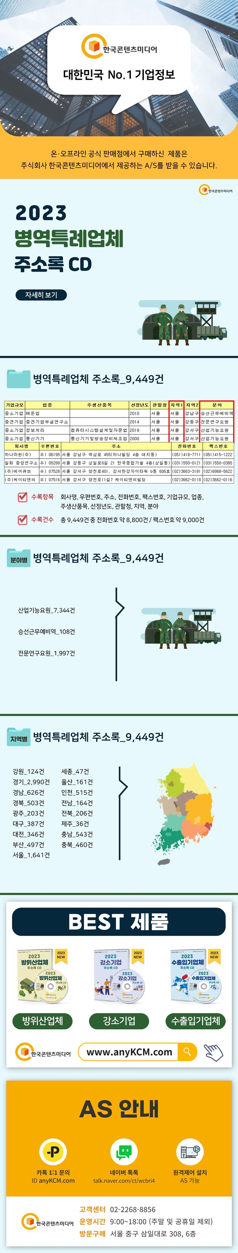 ▶〈2023병역특례업체주소록CD〉란?병역특례업체주소록을분야별,지역별로9,449건수록했습니다.〈책임의한계와법적고지〉·본제품의저작권및판권은주식회사한국콘텐츠미디어에있으며저작권법및소프트웨어법에의해보호받는라이센스저작물이므로무단복제및무단전재를금합니다.·본제품의자료수집한계로인해그정확도가일부제한됨을알려드립니다.·본제품을활용하여영리성광고정보전송을하는경우정보이용촉진및정보보호등에관한법률제50조에따른준수사항을반드시지켜야하며이를어길경우관련법에따라처벌받을수있습니다.·본제품사용에따른결과및판단은민형사를포함한일체가전적으로사용자(사)에게책임이있습니다.·본제품은전자출판물로서해당법령및실천요강을준수합니다.