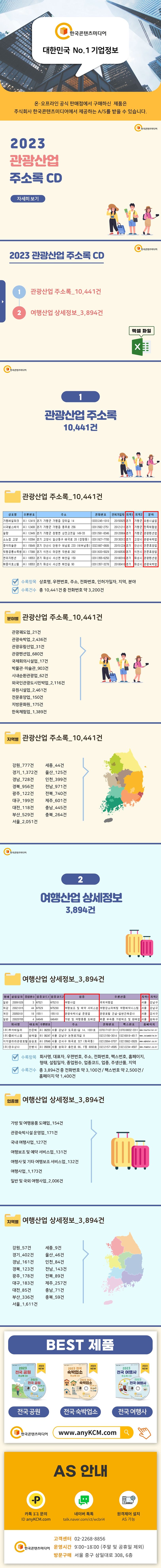 1.관광산업주소록_10,441건수록항목:상호명,우편번호,주소,전화번호,인허가일자,지역,분야수록건수:총10,441건중전화번호약3,200건●분야별①관광궤도업_21건②관광숙박업_2,436건③관광유람선업_31건④관광펜션업_680건⑤국제회의시설업_17건⑥박물관·미술관_903건⑦시내순환관광업_62건⑧외국인관광도시민박업_2,116건⑨유원시설업_2,461건⑩전문휴양업_150건⑪지방문화원_175건⑫한옥체험업_1,389건●지역별①강원_777건②경기_1,372건③경남_728건④경북_956건⑤광주_122건⑥대구_199건⑦대전_118건⑧부산_529건⑨서울_2,051건⑩세종_44건⑪울산_125건⑫인천_399건⑬전남_971건⑭전북_740건⑮제주_601건⑯충남_445건⑰충북_264건2.여행산업상세정보_3,894건수록항목:회사명,대표자,우편번호,주소,전화번호,팩스번호,홈페이지,형태,설립일자,종업원수,업종코드,업종,주생산품,지역수록건수:총3,894건중전화번호약3,100건/팩스번호약2,500건/홈페이지약1,400건●업종별①가방및여행용품도매업_154건②관광숙박시설운영업_171건③국내여행사업_127건④여행보조및예약서비스업_131건⑤여행사및기타여행보조서비스업_132건⑥여행사업_1,173건⑦일반및국외여행사업_2,006건●지역별①강원_57건②경기_402건③경남_161건④경북_123건⑤광주_178건⑥대구_183건⑦대전_85건⑧부산_336건⑨서울_1,611건⑩세종_9건⑪울산_46건⑫인천_84건⑬전남_143건⑭전북_89건⑮제주_257건⑯충남_71건⑰충북_59건