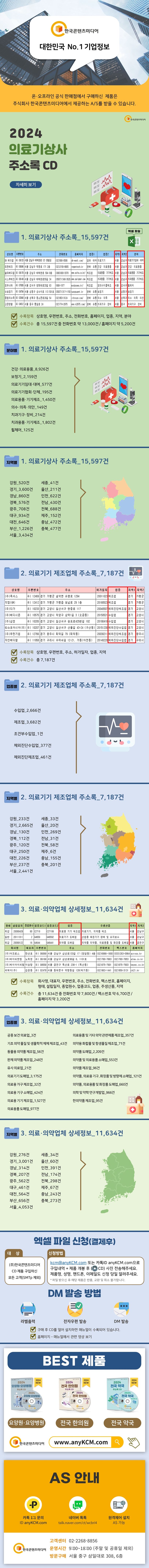 1.의료기상사주소록_15,597건수록항목:상호명,우편번호,주소,전화번호,홈페이지,업종,지역,분야수록건수:총15,597건중전화번호약13,000건/홈페이지약5,200건●분야별①건강·의료용품_8,926건②보청기_2,159건③의료기기임대·대여_577건④의료기기협회·단체_195건⑤의료용품·기기제조_1,450건⑥의수·의족·의안_149건⑦치과기구·장비_214건⑧치과용품·기기제조_1,802건⑨휠체어_125건●지역별①강원_520건②경기_3,600건③경남_860건④경북_576건⑤광주_708건⑥대구_934건⑦대전_646건⑧부산_1,226건⑨서울_3,434건⑩세종_41건⑪울산_211건⑫인천_622건⑬전남_430건⑭전북_688건⑮제주_152건⑯충남_472건⑰충북_477건2.의료기기제조업체주소록_7,187건수록항목:상호명,우편번호,주소,허가일자,업종,지역수록건수:총7,187건주의사항:한회사에서여러업종을다룰경우중복이있습니다.●업종별①수입업_2,666건②제조업_3,682건③조건부수입업_1건④체외진단수입업_377건⑤체외진단제조업_461건●지역별①강원_233건②경기_2,665건③경남_130건④경북_112건⑤광주_120건⑥대구_250건⑦대전_226건⑧부산_237건⑨서울_2,441건⑩세종_33건⑪울산_20건⑫인천_269건⑬전남_31건⑭전북_58건⑮제주_6건⑯충남_155건⑰충북_201건3.의료·의약업체상세정보_11,634건수록항목:회사명,대표자,우편번호,주소,전화번호,팩스번호,홈페이지,형태,설립일자,종업원수,업종코드,업종,주생산품,지역수록건수:총11,634건중전화번호약7,800건/팩스번호약6,700건/홈페이지약3,200건●업종별①공중보건의료업_3건②기초의약물질및생물학적제제제조업_43건③동물용의약품제조업_56건④완제의약품제조업_248건⑤유사의료업_21건⑥의료기기도매업_3,175건⑦의료용가구제조업_32건⑧의료용기구소매업_424건⑨의료용기기제조업_1,527건⑩의료용품도매업_977건⑪의료용품및기타의약관련제품제조업_357건⑫의약용화합물및항생물질제조업_71건⑬의약품도매업_2,209건⑭의약품및의료용품소매업_553건⑮의약품제조업_96건⑯의약품,의료용기구,화장품및방향제소매업_121건⑰의약품,의료용품및화장품도매업_660건⑱의학및약학연구개발업_966건⑲한의약품제조업_95건●지역별①강원_276건②경기_3,001건③경남_314건④경북_207건⑤광주_562건⑥대구_461건⑦대전_564건⑧부산_656건⑨서울_4,053건⑩세종_34건⑪울산_60건⑫인천_391건⑬전남_174건⑭전북_298건⑮제주_67건⑯충남_243건⑰충북_273건