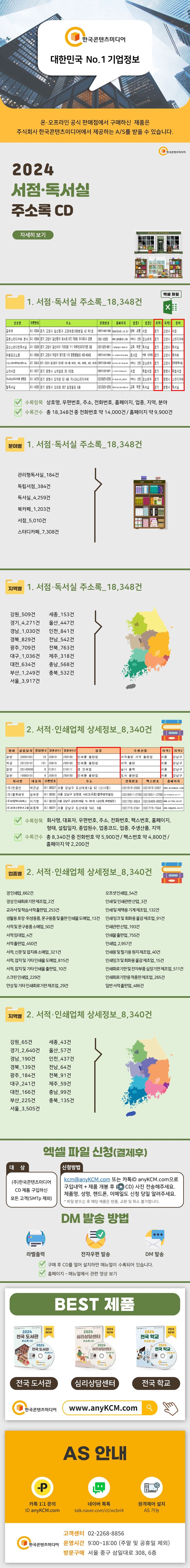 1.서점·독서실주소록_18,348건수록항목:상호명,우편번호,주소,전화번호,홈페이지,업종,지역,분야수록건수:총18,348건중전화번호약14,000건/홈페이지약9,900건●분야별①관리형독서실_184건②독립서점_384건③독서실_4,259건④북카페_1,203건⑤서점_5,010건⑥스터디카페_7,308건●지역별①강원_509건②경기_4,271건③경남_1,030건④경북_829건⑤광주_709건⑥대구_1,036건⑦대전_634건⑧부산_1,249건⑨서울_3,917건⑩세종_153건⑪울산_447건⑫인천_841건⑬전남_542건⑭전북_763건⑮제주_318건⑯충남_568건⑰충북_532건2.서적·인쇄업체상세정보_8,340건수록항목:회사명,대표자,우편번호,주소,전화번호,팩스번호,홈페이지,형태,설립일자,종업원수,업종코드,업종,주생산품,지역수록건수:총8,340건중전화번호약5,900건/팩스번호약4,800건/홈페이지약2,200건●업종별①경인쇄업_662건②경성인쇄회로기판제조업_2건③교과서및학습서적출판업_253건④생활용포장·위생용품,문구용품및출판인쇄물도매업_13건⑤서적및문구용품소매업_50건⑥서적임대업_4건⑦서적출판업_450건⑧서적,신문및잡지류소매업_321건⑨서적,잡지및기타인쇄물도매업_815건⑩서적,잡지및기타인쇄물출판업_10건⑪스크린인쇄업_229건⑫연성및기타인쇄회로기판제조업_29건⑬오프셋인쇄업_54건⑭인쇄및인쇄관련산업_3건⑮인쇄및제책용기계제조업_132건⑯인쇄잉크및회화용물감제조업_91건⑰인쇄관련산업_193건⑱인쇄물출판업_755건⑲인쇄업_2,957건⑳인쇄용및필기용원지제조업_40건㉑인쇄잉크및회화용물감제조업_15건㉒인쇄회로기판및전자부품실장기판제조업_511건㉓인쇄회로기판용적층판제조업_265건㉔일반서적출판업_486건●지역별①강원_65건②경기_2,640건③경남_190건④경북_139건⑤광주_184건⑥대구_241건⑦대전_166건⑧부산_225건⑨서울_3,505건⑩세종_43건⑪울산_57건⑫인천_437건⑬전남_64건⑭전북_91건⑮제주_59건⑯충남_99건⑰충북_135건