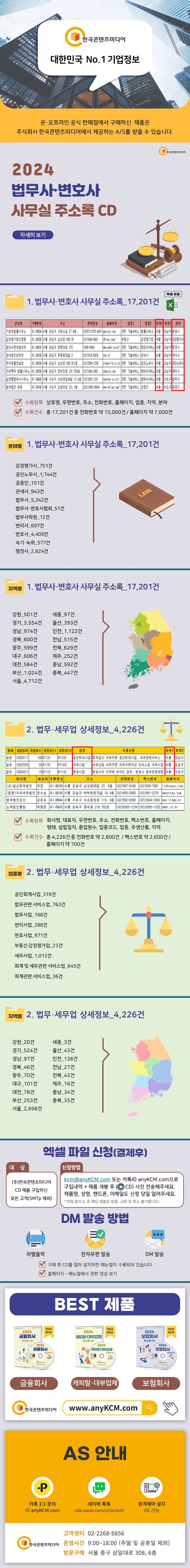 1.법무사·변호사사무실주소록_17,201건수록항목:상호명,우편번호,주소,전화번호,홈페이지,업종,지역,분야수록건수:총17,201건중전화번호약15,000건/홈페이지약7,000건●분야별①감정평가사_751건②공인노무사_1,744건③공증인_151건④관세사_943건⑤법무사_5,242건⑥법무사·변호사협회_51건⑦법무사학원_12건⑧변리사_697건⑨변호사_4,409건⑩속기·녹취_577건⑪행정사_2,624건●지역별①강원_501건②경기_3,554건③경남_974건④경북_600건⑤광주_599건⑥대구_606건⑦대전_584건⑧부산_1,024건⑨서울_4,712건⑩세종_97건⑪울산_393건⑫인천_1,122건⑬전남_515건⑭전북_629건⑮제주_252건⑯충남_592건⑰충북_447건2.법무·세무업상세정보_4,226건수록항목:회사명,대표자,우편번호,주소,전화번호,팩스번호,홈페이지,형태,설립일자,종업원수,업종코드,업종,주생산품,지역수록건수:총4,226건중전화번호약2,800건/팩스번호약2,600건/홈페이지약700건●업종별①공인회계사업_319건②법무관련서비스업_763건③법무사업_168건④변리사업_288건⑤변호사업_971건⑥부동산감정평가업_23건⑦세무사업_1,013건⑧회계및세무관련서비스업_645건⑨회계관련서비스업_36건●지역별①강원_20건②경기_524건③경남_97건④경북_46건⑤광주_70건⑥대구_101건⑦대전_78건⑧부산_253건⑨서울_2,698건⑩세종_3건⑪울산_43건⑫인천_138건⑬전남_27건⑭전북_43건⑮제주_16건⑯충남_34건⑰충북_35건