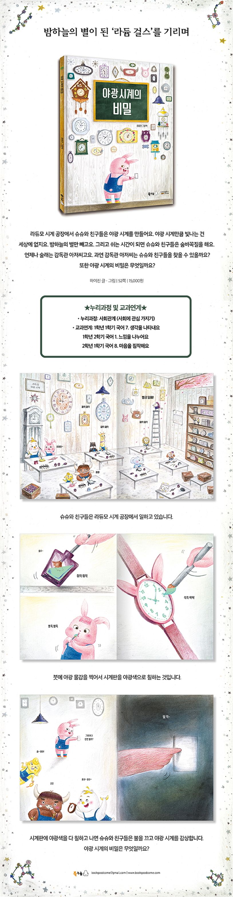 라듀모 시계 공장에서 슈슈와 친구들은 야광 시계를 만들어요. 야광 시계만큼 빛나는 건 세상에 없지요. 밤하늘의 별만 빼고요. 그리고 쉬는 시간이 되면 슈슈와 친구들은 숨바꼭질을 해요. 언제나 술래는 감독관 아저씨고요. 과연 감독관 아저씨는 슈슈와 친구들을 찾을 수 있을까요? 또한 야광 시계의 비밀은 무엇일까요?